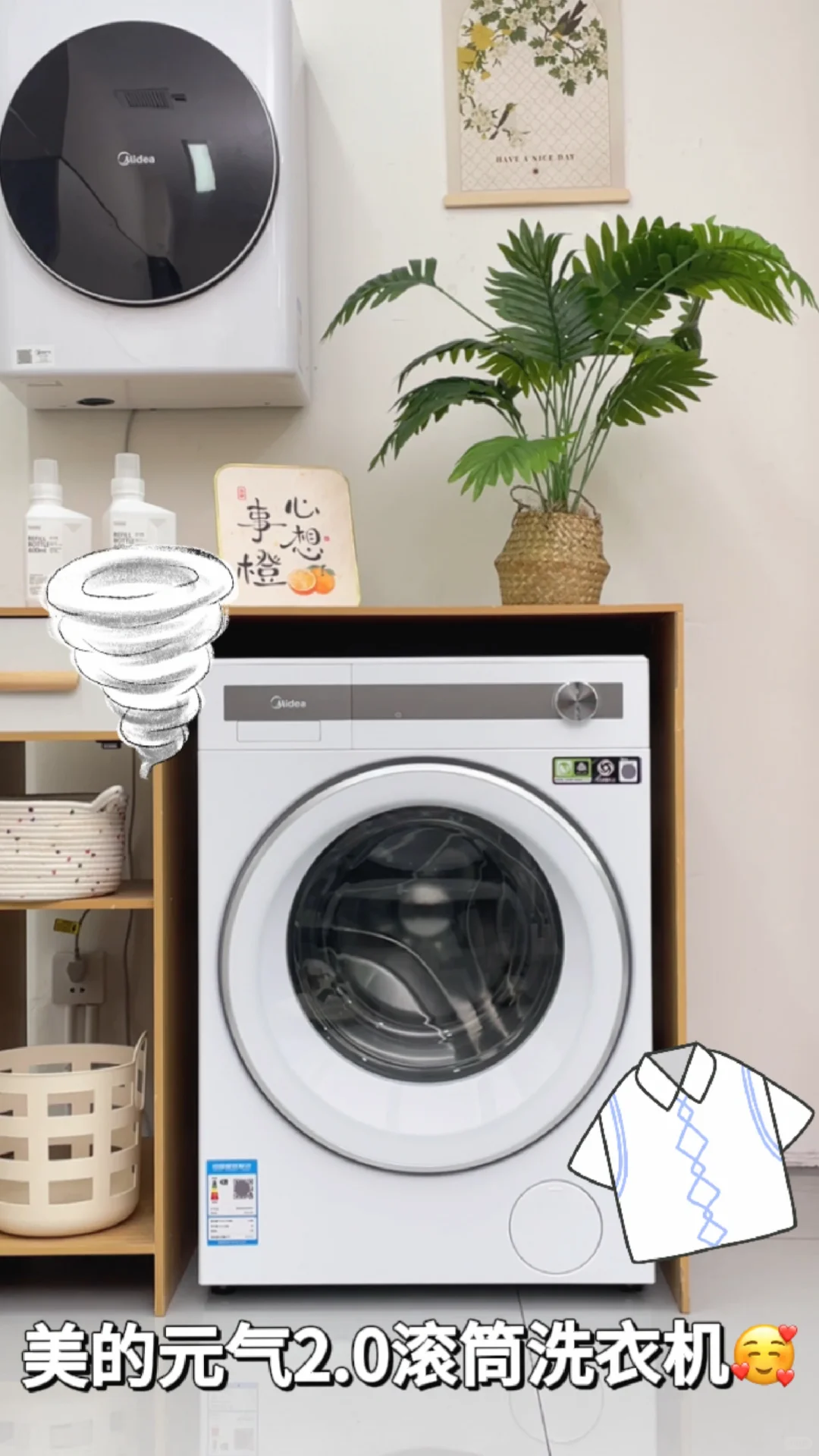 4.美的元气2.0滚筒洗衣机不占地方。60cm的主流柜体,就能放下它,像我家的这种小平方的‘胃口’!小户型,只要预留60cm的柜体就能放的得下,15mm的微缝安装,不多余也不会凸出,和室内的格调也能融合在一起!