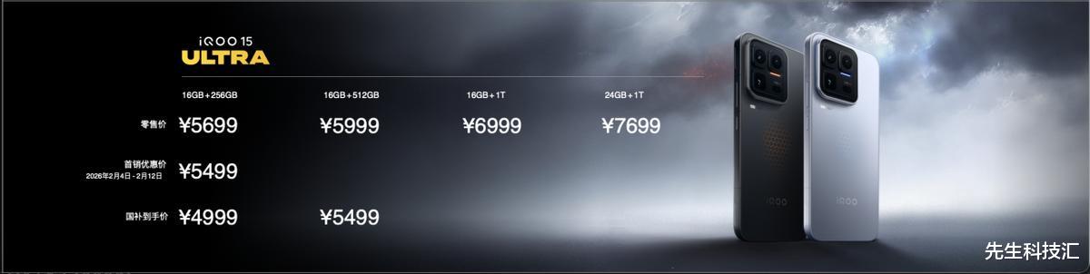 iQOO 15 Ultra提供四个版本:16GB+256GB首销优惠价5499元(2月4日-12日);16GB+512GB零售价5999元,以上两版本均可再享至高500元国补优惠;16GB+1TB售价6999元;24GB+1TB售价7699元。购机用户尊享至高24期分期免息、五年风扇宝、以旧换新大额补贴等权益。