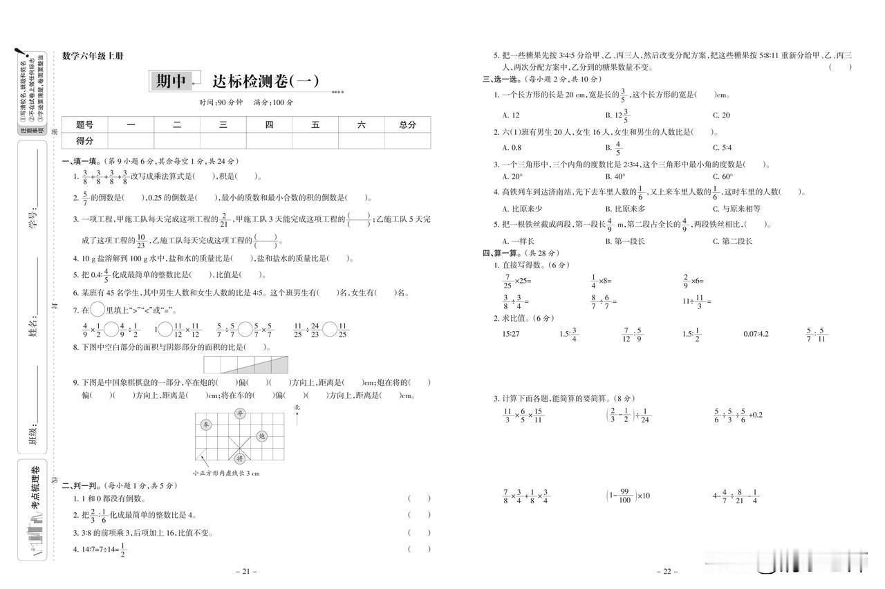 2024秋人教版数学六年级上册期中达标检测卷(一)
