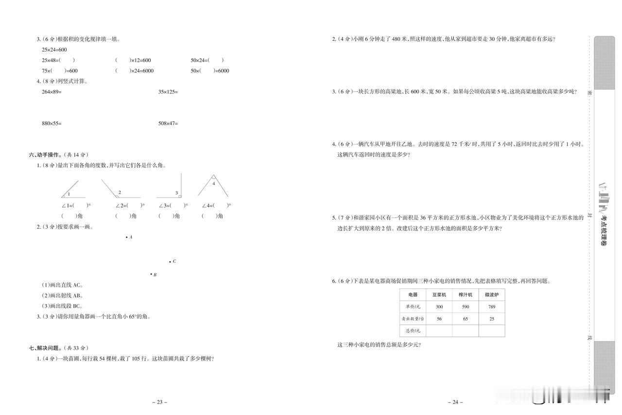 2024秋人教版数学四年级上册期中达标检测卷(一)