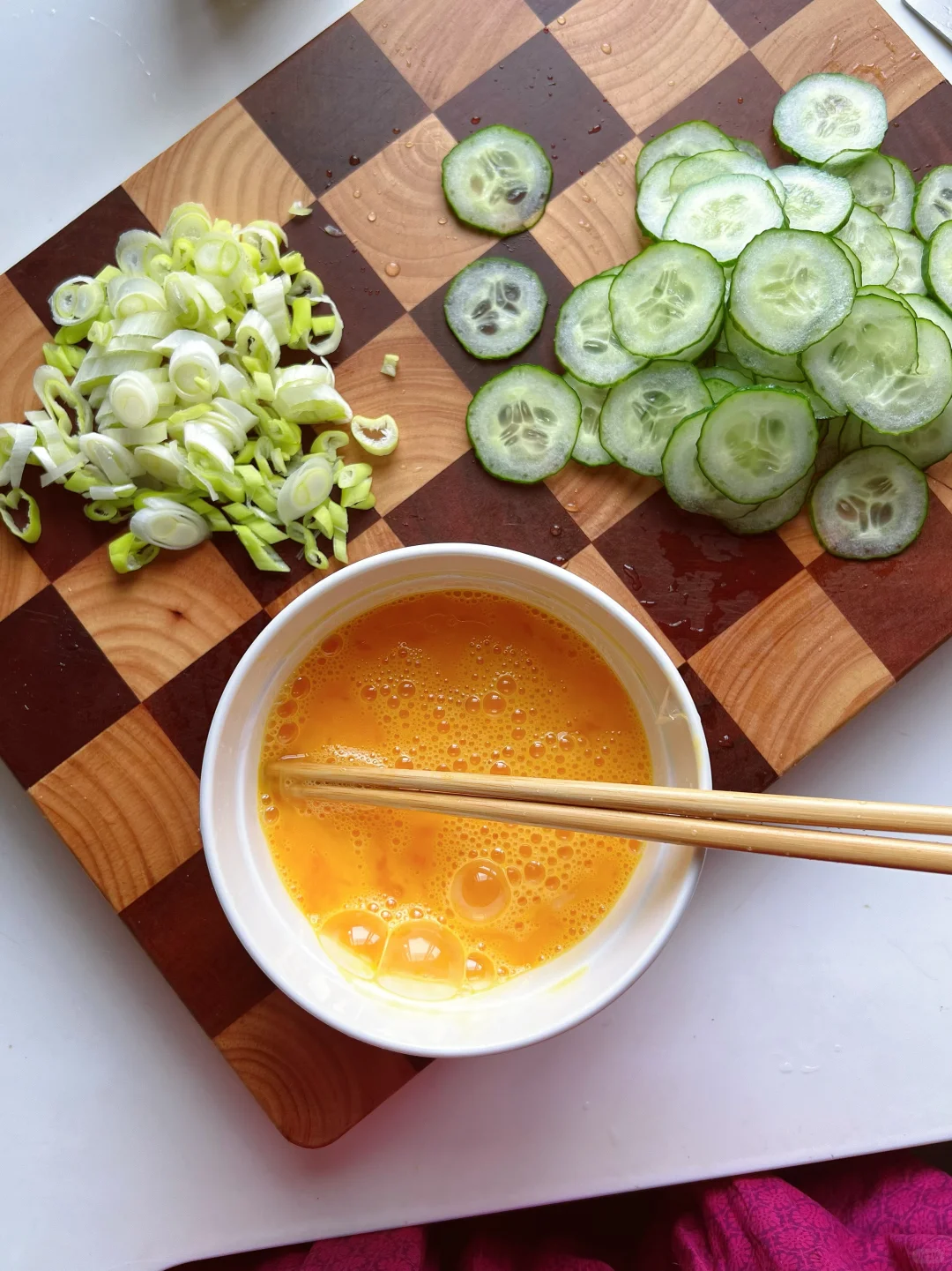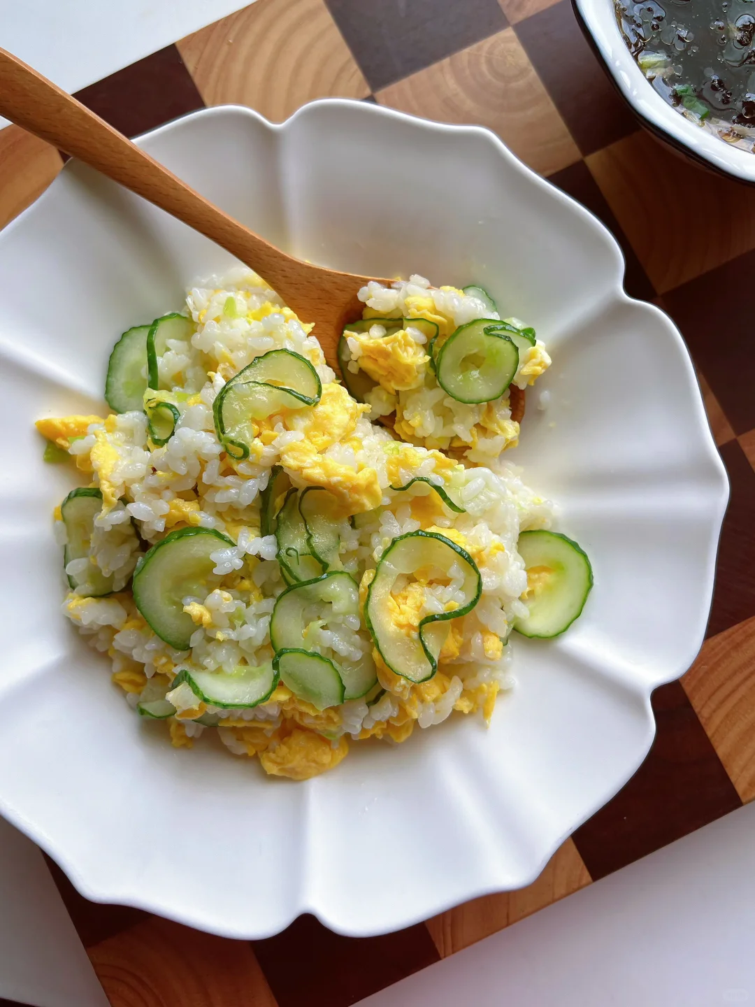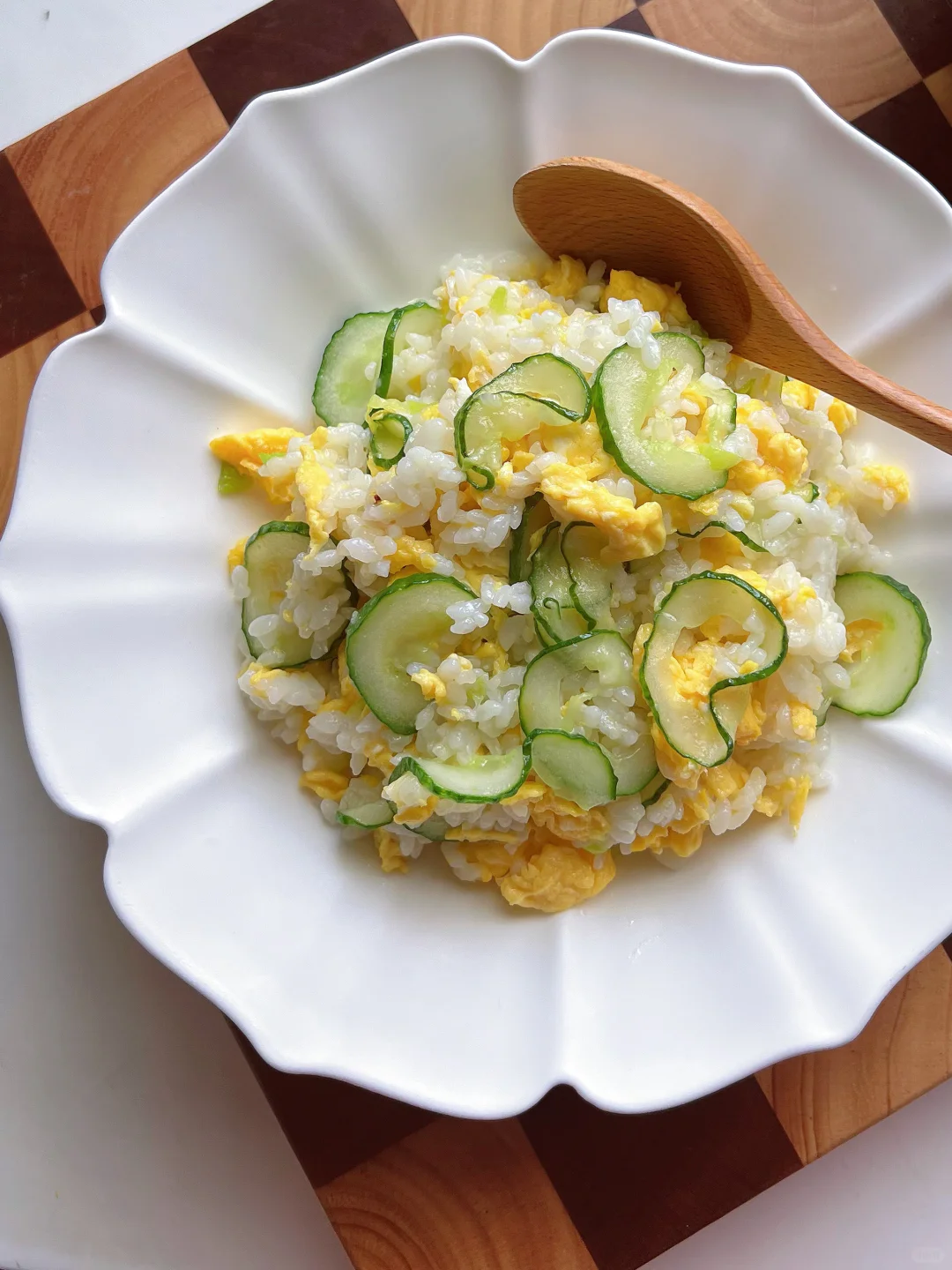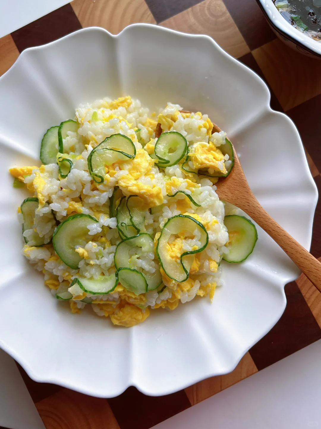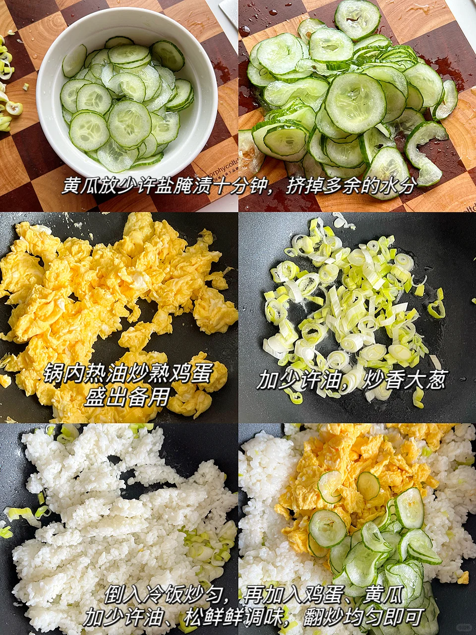 2⃣️热锅加少许油,炒香大葱,加入米饭炒匀,再加入鸡蛋、黄瓜翻炒均匀,最后加少许盐调味即可