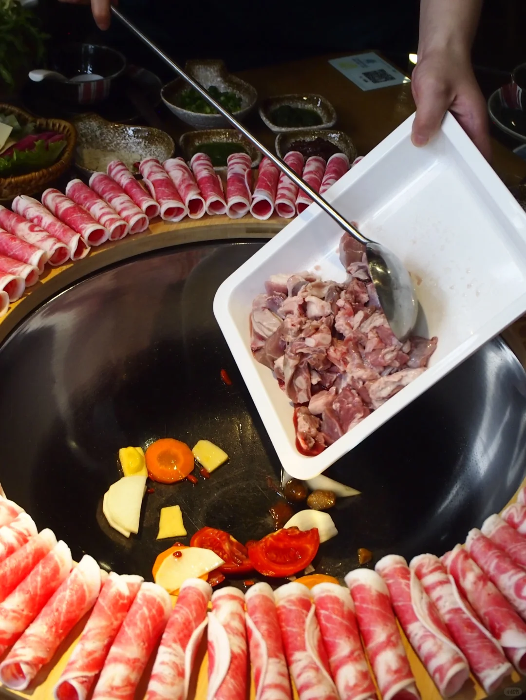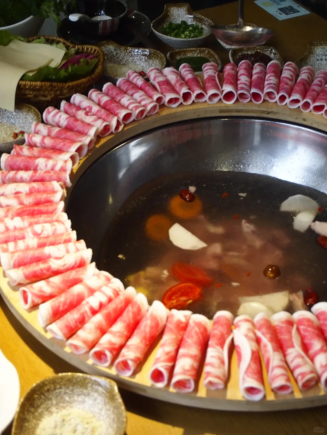 特色锅底,汇聚新疆大枣、宁夏枸杞等优质食材,汤香浓郁。精选羔羊肉,久煮不老,肥而不腻,几乎没有羊膻味😁,秘诀就在于它们吃的是天然饲料。