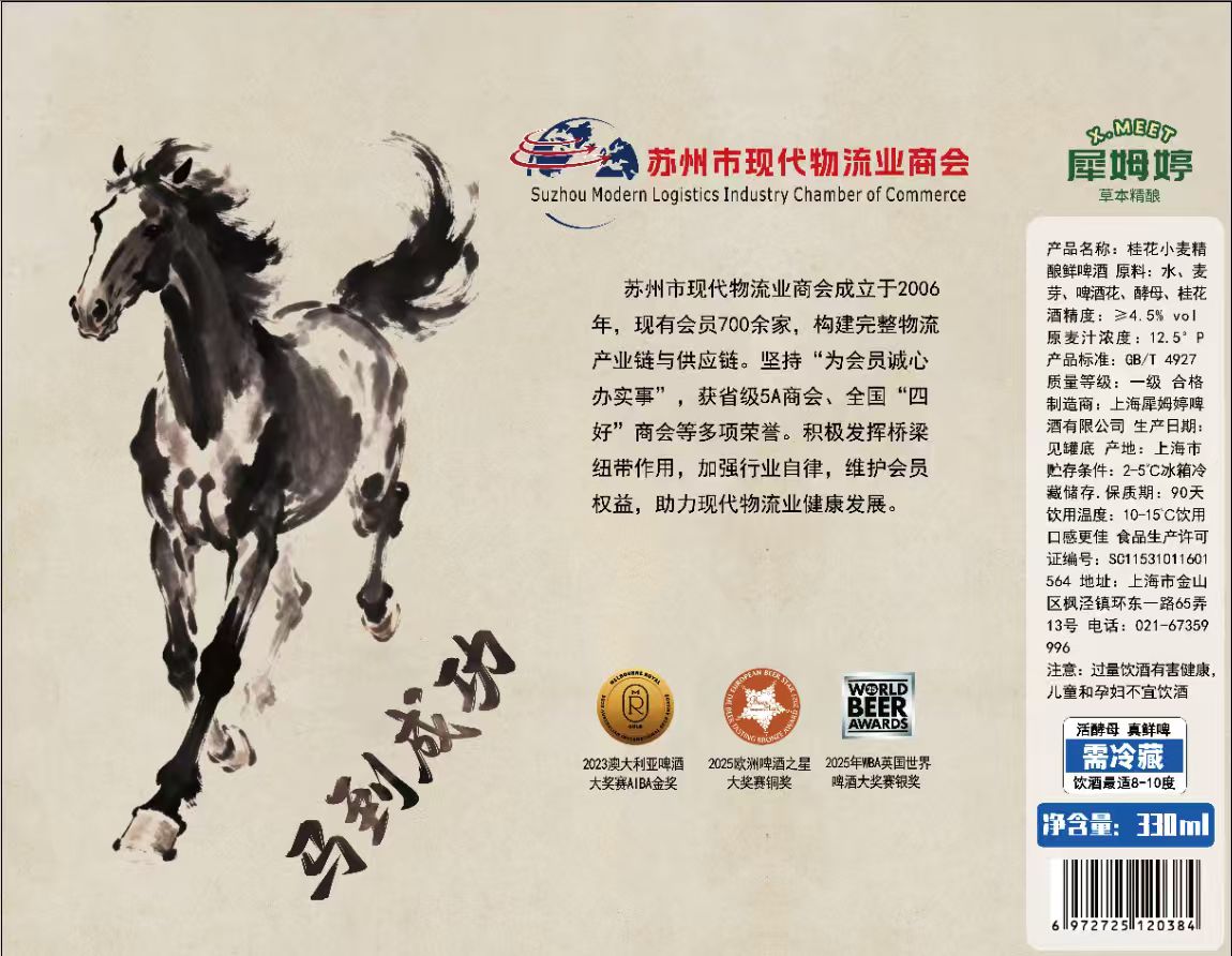 当苏州现代物流协会的盛会启幕,犀姆婷定制款桂花小麦精酿,以最新鲜的姿态,呈现在每一张宴席之上。当物流人——这群奔跑在路上的行者,高高举起酒杯,绵密的泡沫泛起,会场的热烈瞬间爆棚,如世界杯赛场的欢呼般汹涌,洋洋洒洒的歌声里,是奋斗者的豪情,是同行者的共鸣。