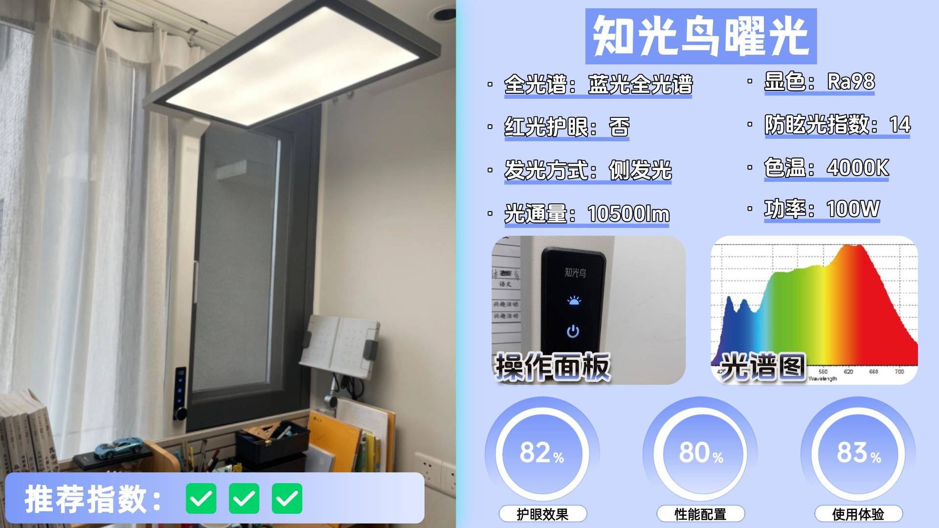 护眼大路灯品牌哪个专业?知光鸟曜光光源配置上采用全光谱灯珠并搭配普瑞芯片,整体的光源稳定,并且整灯光通量约10500lm,中心照度可达1938lux,出光结构以侧向发光为主,使光线分布更均匀,亮度支持多档位调节,可根据不同学习或使用场景进行灵活切换,不过在高亮度状态下,这款灯近距离使用仍出现了轻微的刺眼感,在一定程度上影响着使用体验。