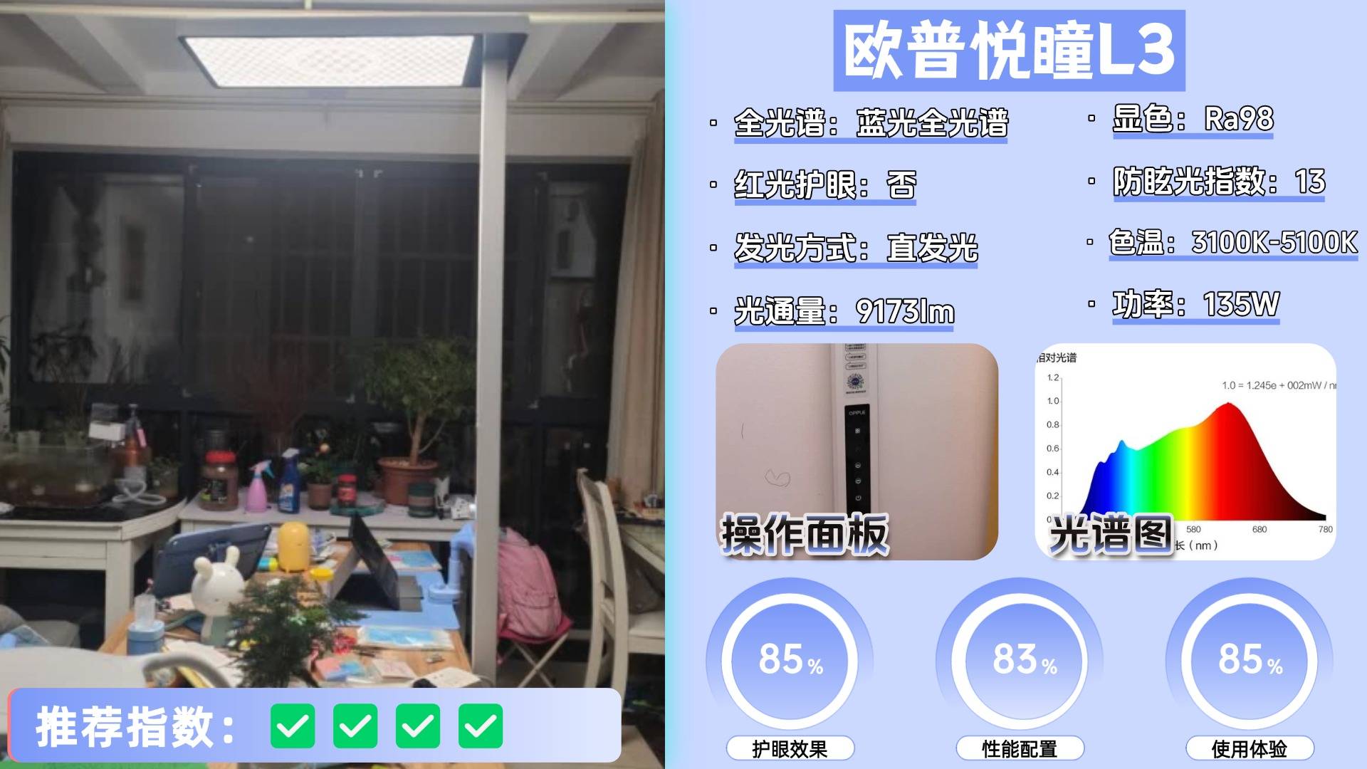 护眼大路灯品牌哪个专业?欧普悦瞳 L1 采用一体式发光面,光线可覆盖面积约 10-30㎡,上下光源支持独立调节,能够根据不同使用需求灵活分配光线层次,在光学表现上,整体光照均匀度为 1.03,搭配4000K的舒适色温,画面明亮且色彩还原相对自然,使用体验方面,这款灯支持智能语音控制,不过整体亮度输出偏高,对强光较敏感的人在初次使用时可能会有轻微不适,同时在自然光还原层面仍有优化空间。