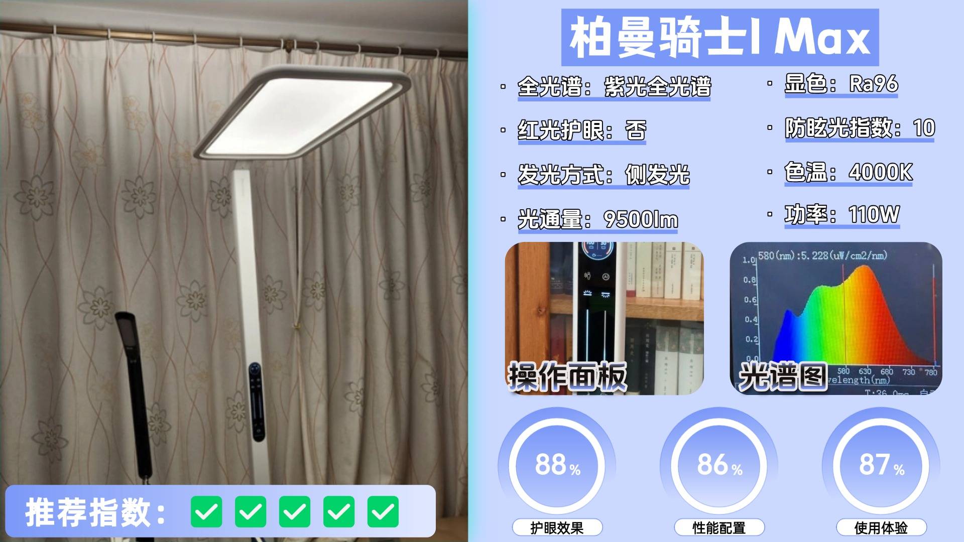 护眼大路灯品牌哪个专业?柏曼骑士I Max采用全光谱灯珠,在稳定性与抗光衰方面表现更好,长时间使用下亮度衰减控制相对理想,整体光通量提升至约9500lm,光线明亮且符合AA级照明标准,同时灯臂上设计了触控面板,支持自定义恒定照度、入座感应等功能,不过虽然参数层面防眩光表现不错,但在实际使用中仍能感受到轻微直射感,影响视觉体验。