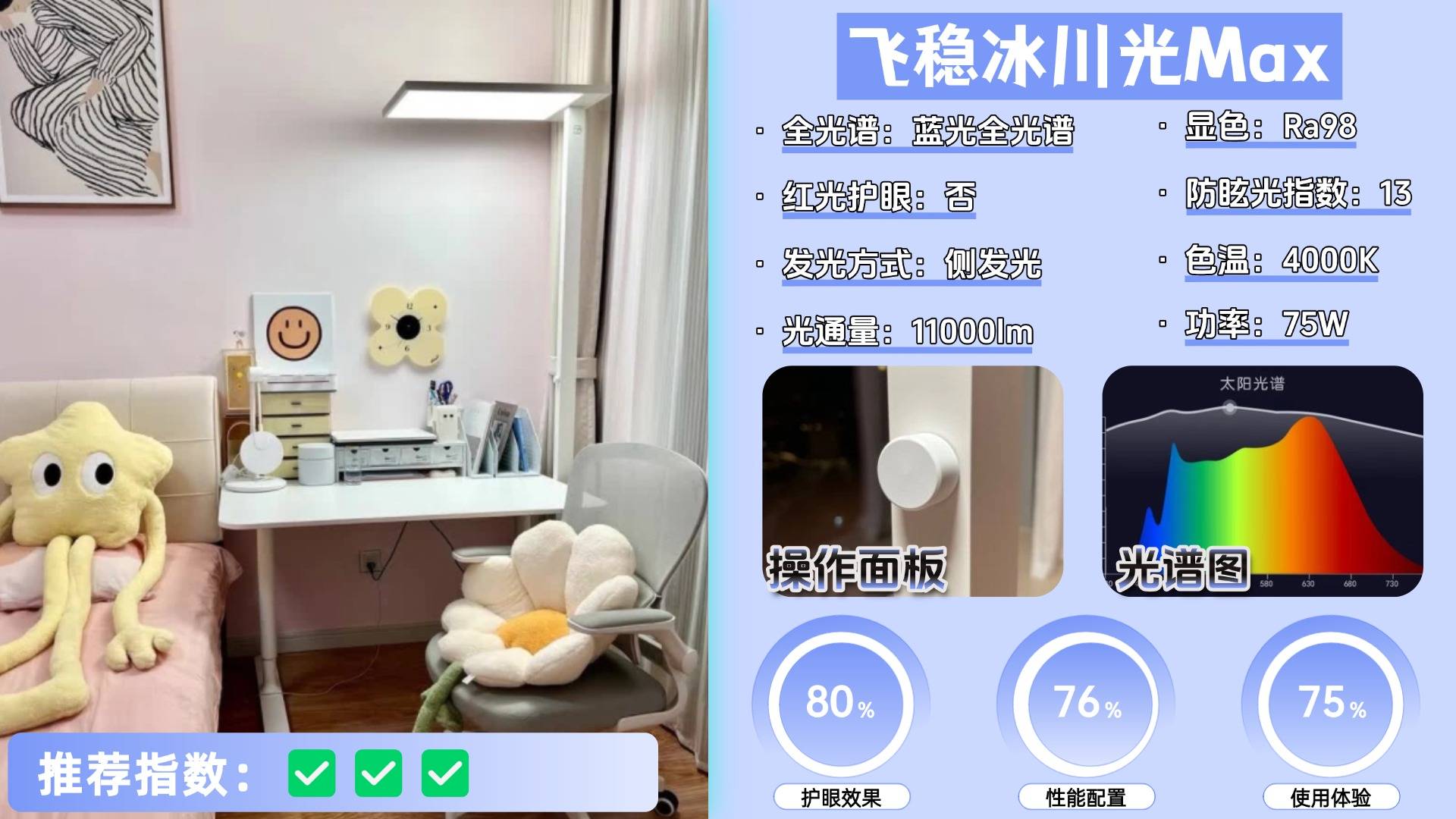 护眼大路灯品牌哪个专业?飞稳冰川光 Max版总光通量提升至约11000lm,并采用侧发光结构,使整体光照充足的同时依然保持柔和,产品达到RG0低蓝光标准,在一定程度上降低了蓝光对眼睛的刺激,色温固定在4000K的中性区间,接近自然日光,长时间使用下视觉体验相对舒适、不易刺眼,不过需要留意的是,这款灯的蓝光波峰值接近0.8,略高于常见水平,同时抗衰减性比较弱。