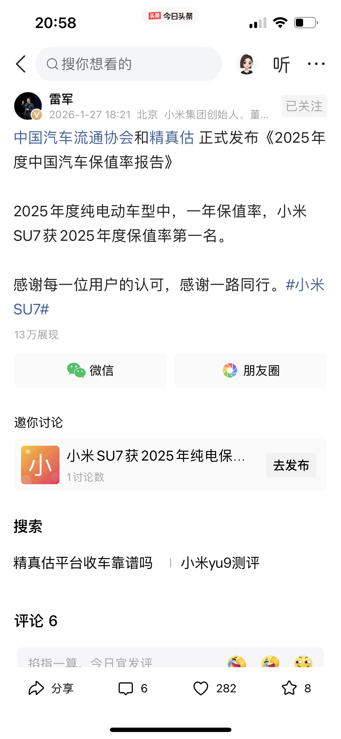 到底是不是第一?雷总说苏七是纯电车型一年保值率第一,但是查看完整榜单,苏七是第七。到底是不是第一?