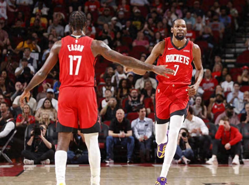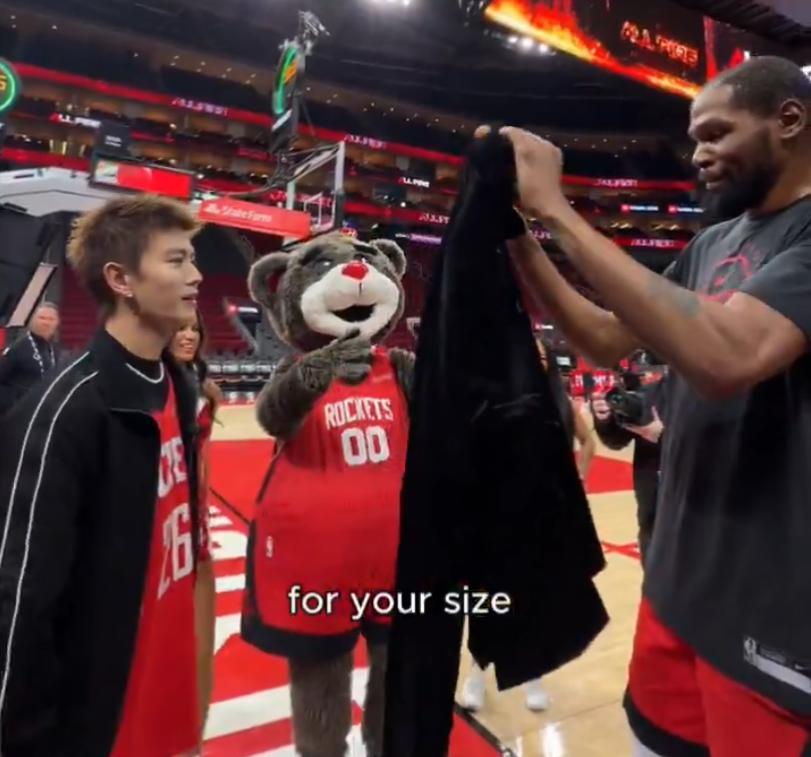 当夜的休斯敦球馆比往常更热闹一些。看台上有中国明星任嘉伦的身影,他带着一袭唐装,和杜兰特在赛前有过短暂交流。一段来自娱乐圈的跨界互动,让火箭主场的气氛提前加温。杜兰特收到量身定制的中国风唐装后,回赠火箭7号球衣,双方都带着点腼腆的笑意。合照环节火箭熊与啦啦队也加入他们,杜兰特全程笑容明朗,任嘉伦还调侃希望杜兰特能像自己一样帅。