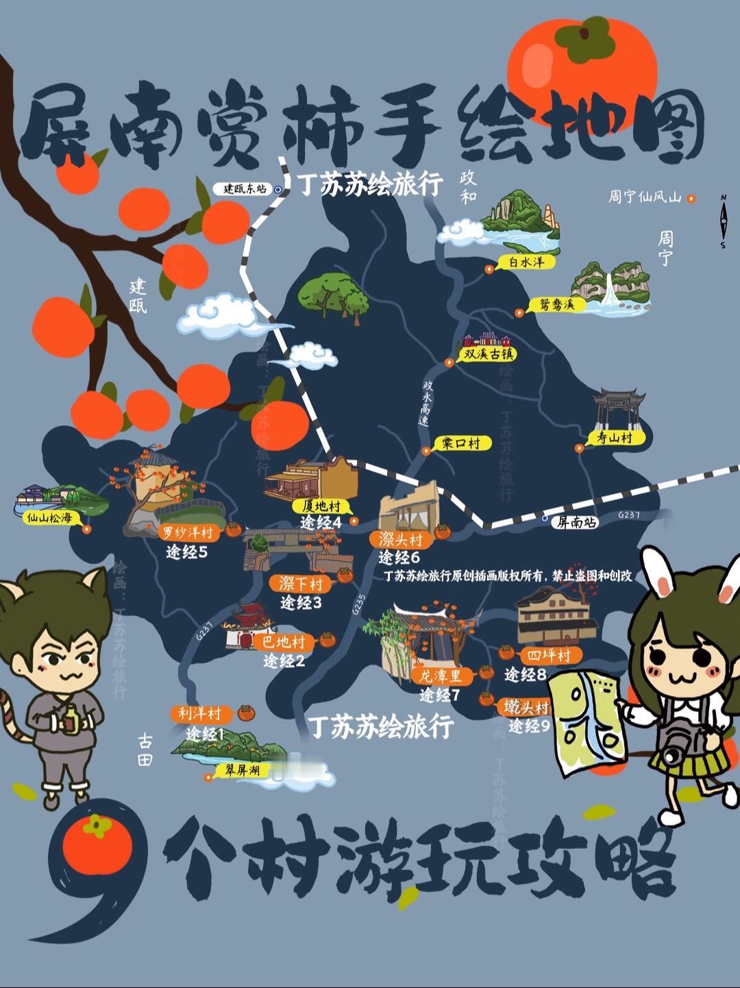 11月,福建宁德热门的屏南县城赏柿子季节,答应朋友们的屏南赏柿手绘地图做出来啦‼️ 打通9️⃣个村游玩攻略‼️ 🚗由于交通不太便利,想一次性多走几个古村连着玩,自驾才能都盘一遍。 🗺️这次的手绘地图功能,以自驾线路顺时针规划,连成紧凑乡村游。 🏘️反正知名村村都可以住,所以2日1夜、3日2夜都行。 ❤️原创绘画:丁苏苏绘旅行 ⚠️原创版权所有,请勿盗用和二创必究 1️⃣龙潭里村🍅叶子还没掉,错落有致,面积小、有炒菜、📷👍、🅿️、🚻 2️⃣厦地村🍅今年没有柿子明年才有,面积小、书店👍、民宿📷👍、☕️🅿️🚻🐱🐶 3️⃣漈头村🍅无,拌面🍜扁肉👍、面积小,夜景👍、☕️🅿️🚻 4️⃣四坪村🍅叶子没掉,面积大,建议游玩两天,机位多好出片👍,小吃👍🅿️🚻 5️⃣罗纱洋村🍅叶子还没掉,面积中,有观景台,扁肉店👍、🅿️ 6️⃣巴地村🍅果实上有黑点,不建议,看点畲族,🅿️ 7️⃣漈下村🍅就一颗在廊桥边,适合航拍、有炒菜👍 8️⃣墘头村🍅叶子还没掉,面积小,夜景👍、☕️🅿️ 9️⃣利洋村🍅叶子掉了,位置在山头上,村里没有附近翠屏湖👍 不定期更新柿子村动态‼️ 📷丁苏苏摄影贴士: 1️⃣拍柿子遇到阴天,那就等落日后的蓝光时刻拍摄,有些古厝灯光冷暖更美 2️⃣建议叶子掉光再去拍摄更好看[吐舌] 3️⃣穿米色、咖色衣服适合 ⚠️屏南特产还有水边的小黑虫,大家记得拍照吃饭时要提早防护! ㊗️大家柿柿如意❤️ #创作灵感 #寻找100个城市路线图鉴 #屏南旅游 #柿子红了 #每一帧都是热爱