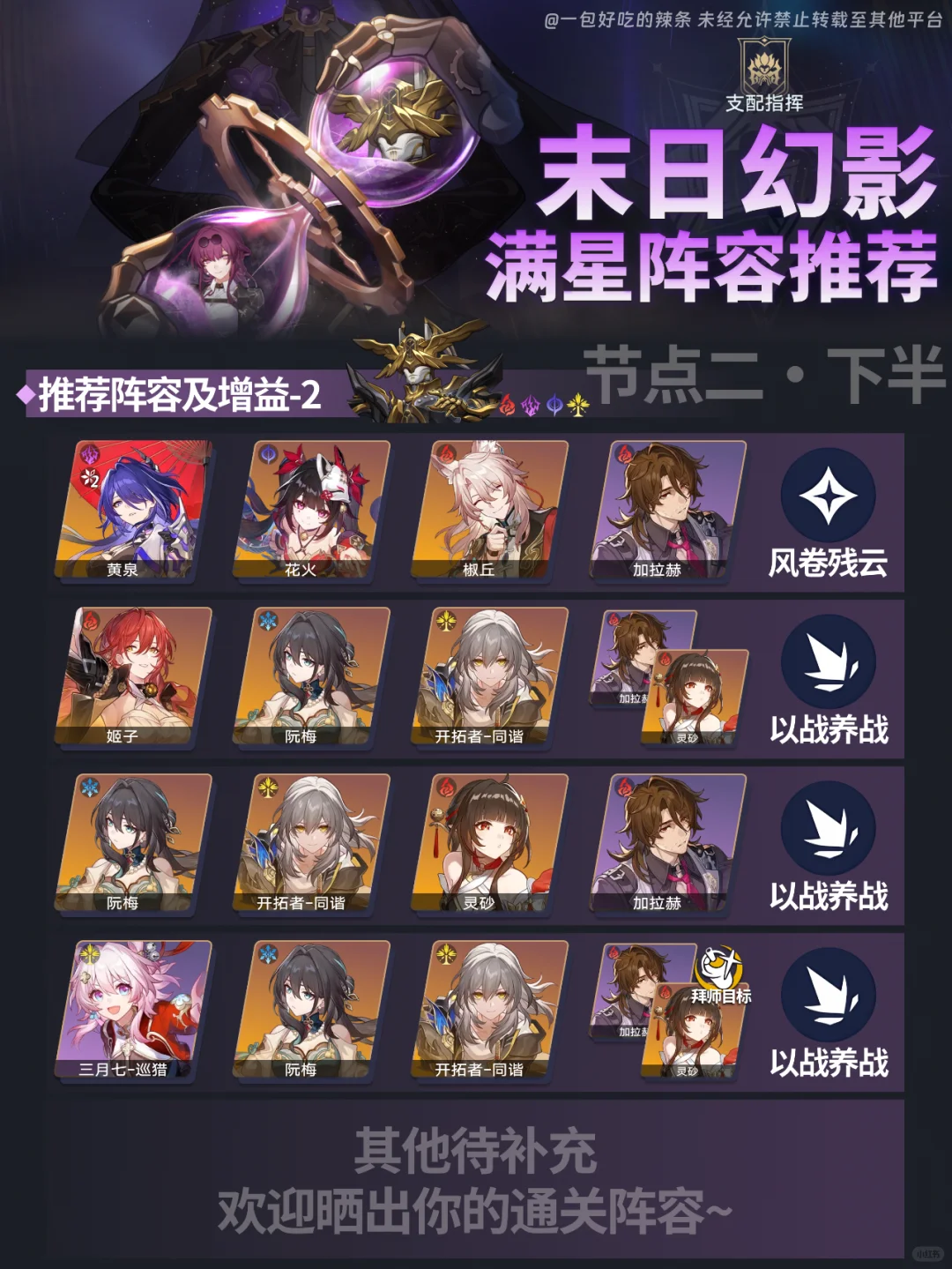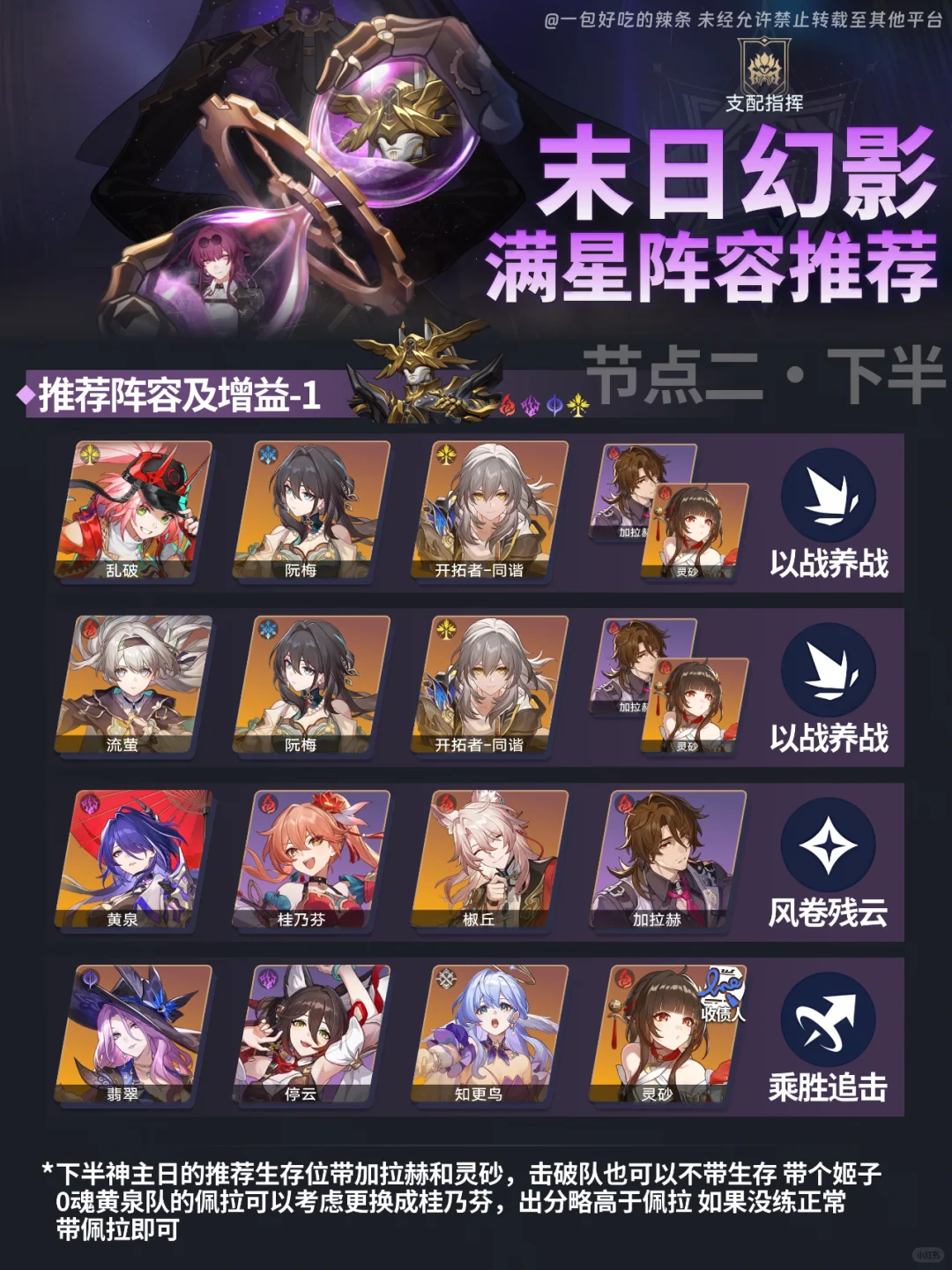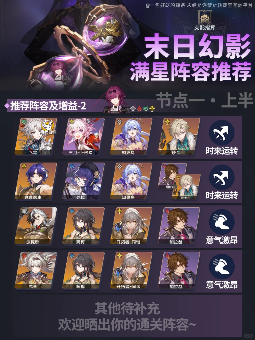 大家好,这里是辣条~ 本期是2.6混沌回忆阵容推荐 这期末日上半其实和2.4差不多,比较简单,免费的00真理+知更鸟就能打3300分+ 下半是神主日首秀,一些玩家可能对之前主线的周日哥有一定的阴影 不过末日的周日哥不算很难,姬子超击破队也能有3300分 —————————————