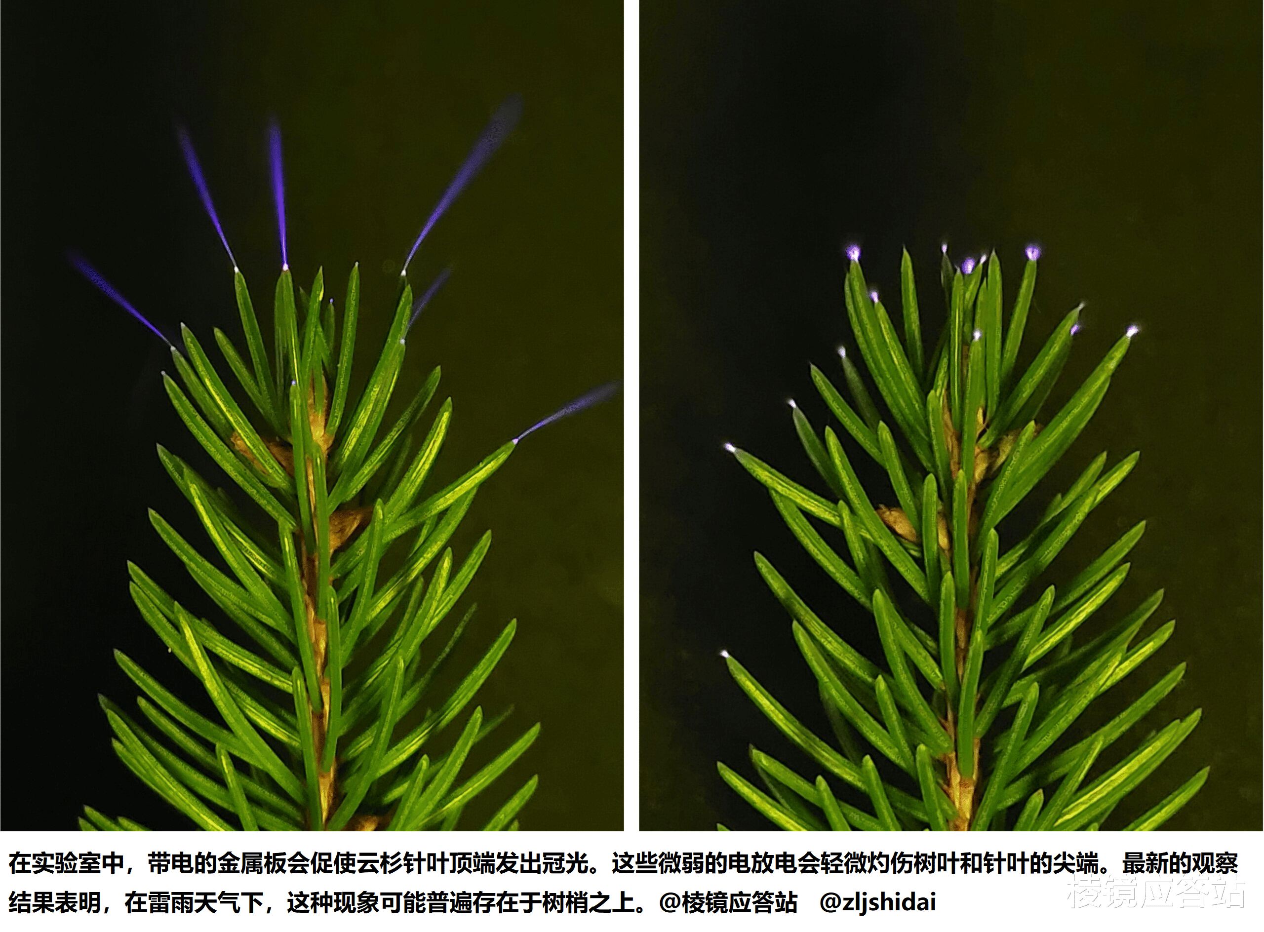 原理其实也不复杂哈,雷暴云层在头顶积攒了大量负电荷,地面因为感应就产生了相反的正电荷,这些电荷顺着最高的导体也就是树冠上的叶尖聚集起来。