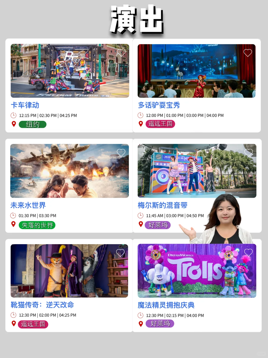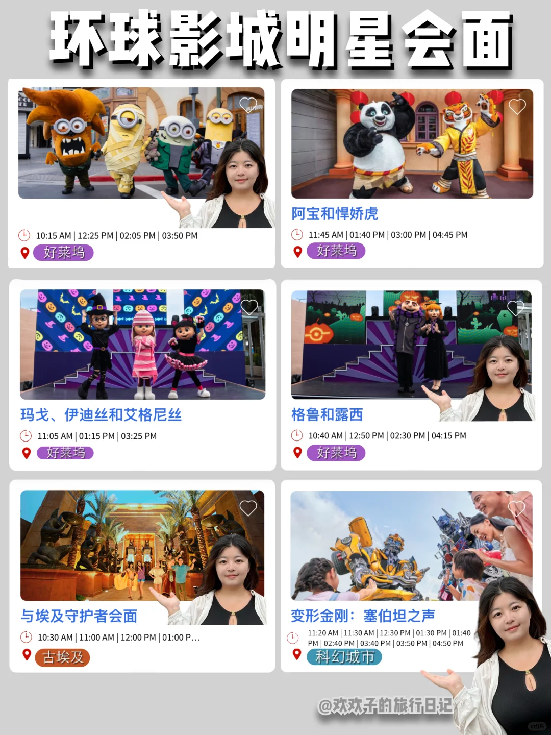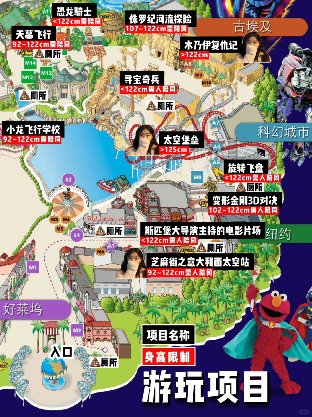 新加坡环球影城大概是北京环球影城的一半大小。我一天就刷完了所有项目,还和好几个环球影城明星合影。结束后还去圣陶沙之星玩了玩! - 秘诀: 1️⃣提前下载好新加坡环球影城A.P.P 可以看到实时的排队情况。一般热门的项目是变形金刚/木乃伊复仇记,哪个人少冲哪个。 2️⃣建议早上9:30前到达园区 官方开门时间是10:00,可以先和🌍合影。 3️⃣可以提前在Klook上线上购买门票 手机上截图保存好code,入园扫描直接进入,很方便(还经常有折扣活动可以蹲) 4️⃣阴天或者雨过天晴后去玩 - 项目: A.P.P可以看到排队时间,一般热门的项目是变形金刚/木乃伊复仇记,哪个人少先冲哪个。 🥰刺激的/微刺激的: ①变形金刚3D对决 戴上3D眼镜,乘坐滑轨车,仿佛置身于变形金刚的电影世界中,与汽车人和霸天虎并肩作战。 ②木乃伊复仇记 室内过山车,穿越神秘的地下宫殿,过山车还会后退哦 ③漂流 体验感很好,不用想象选座位玄学,之前看别的攻略说坐左手位不会淋湿,其实一直转转转,最后是概率性事件,只有我们淋的最湿。门口有卖雨衣的,也有烘干的(付费) 🥰适合亲子的/不刺激的: ①魔法转轮 史瑞克影院出来就是,很小很小的室内摩天轮,比较无聊。 ②史瑞克4D影院 前奏很长,而且全程英文无字幕。 ③斯匹堡大导演主持的电影特效 全程英文。 ④小龙飞行学校 特别为小朋友设计的过山车 ⑤寻宝奇兵 车在轨道上慢慢开,感觉一般,排队却很长,很温和,适合亲子。 ⑥芝麻街 车在轨道上开,很沉浸很好玩,可玩度高,适合亲子。(个人觉得很好看!) ⑦斯匹堡大导演主持的电影特效 ⑧穿靴子的猫剑客历险记:一群人一起过山车,中间有小失重 项目位置&个人评分&身高限制,我放在图2图3了。 - 环球影城明星会面: 位置,见面时间,见面内容我放在图4了。 新加坡环球影城明星见面会,队伍是我见过最短的。工作人员服务也很好,会帮你用手机拍照(免费),还会教你比姿势。 - 演出: 表演时间表&位置我放在图5了。 - 吃饭: 如果追求性价比可以在外面马来西亚食阁 吃,好吃不贵,味道美味。食物是不能带到里面去的。 新加坡环球影城里的可乐是4新币一罐,可以刷卡。