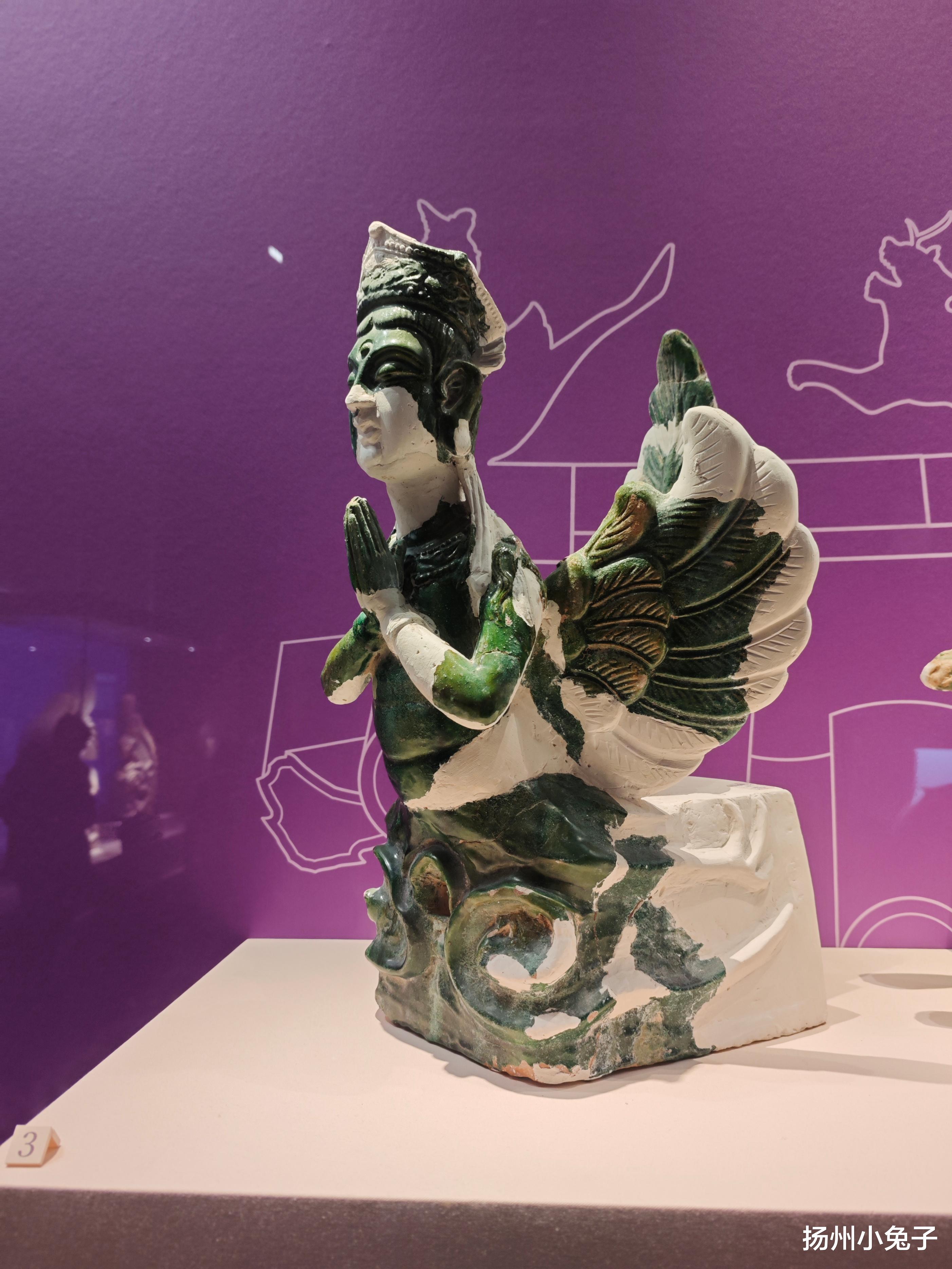 展品中的伽林频迦,有灰陶制成品、红陶制成品,还有绿釉制成品。尤其那尊绿釉迦陵频伽,一眼看去就让人的心静下来。她神态静谧安详,椭圆形脸。她双颊丰腴,细眉长眼且眼帘低垂。她双眉之间有神奇的白毫。高高的鼻梁,小小的嘴巴,有着党项人的明显特征。