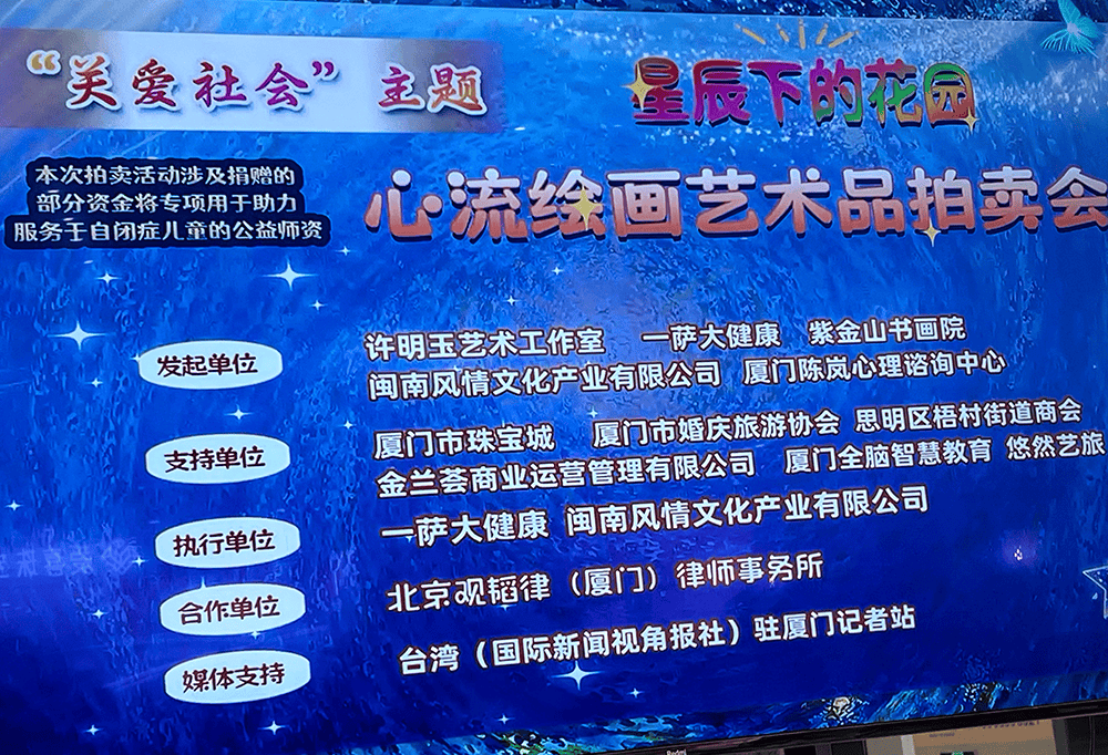 据悉,本次“星辰下的花园心流绘画艺术品拍卖会”由许明玉艺术工作室、一萨大健康、紫金山书画院、闽南风情文化产业有限公司、厦门陈岚心理咨询中心联合发起,厦门市珠宝城、厦门市婚庆旅游协会、思明区梧村街道商会、金兰荟商业运营管理有限公司、厦门全脑智慧教育、悠然艺旅等单位提供支持;一萨大健康、闽南风情文化产业有限公司担任执行单位,北京观韬律师(厦门)事务所为合作单位,台湾《国际新闻视角报社》驻厦门记者站提供媒体支持。