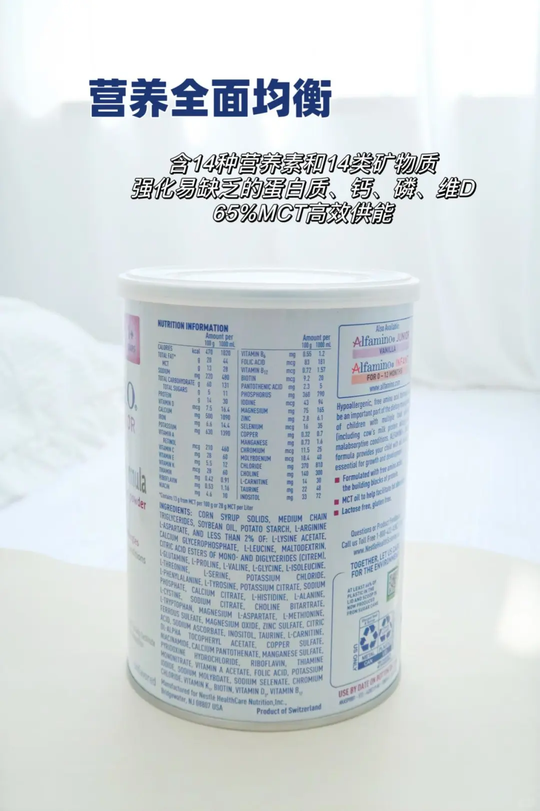 它是100%游离氨基酸,营养全面均衡,特别强化了敏宝容易缺少的各类营养素,宝宝成长的强力后盾🛡️65%MCT高含量,可以“快充式”给宝宝提供能量,也更容易吸收和耐受。而且口味清淡,宝宝容易接受👍,适合食物敏敏的宝宝~