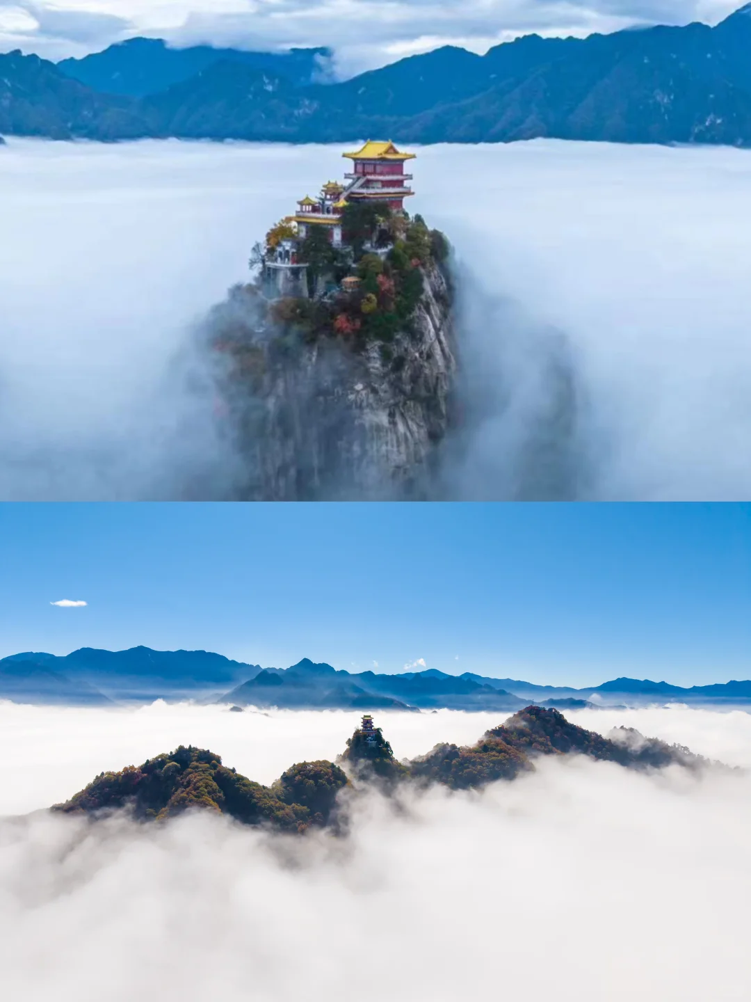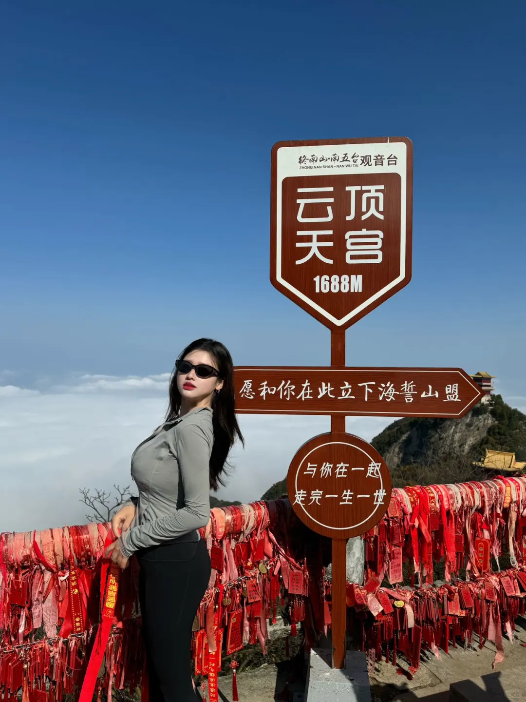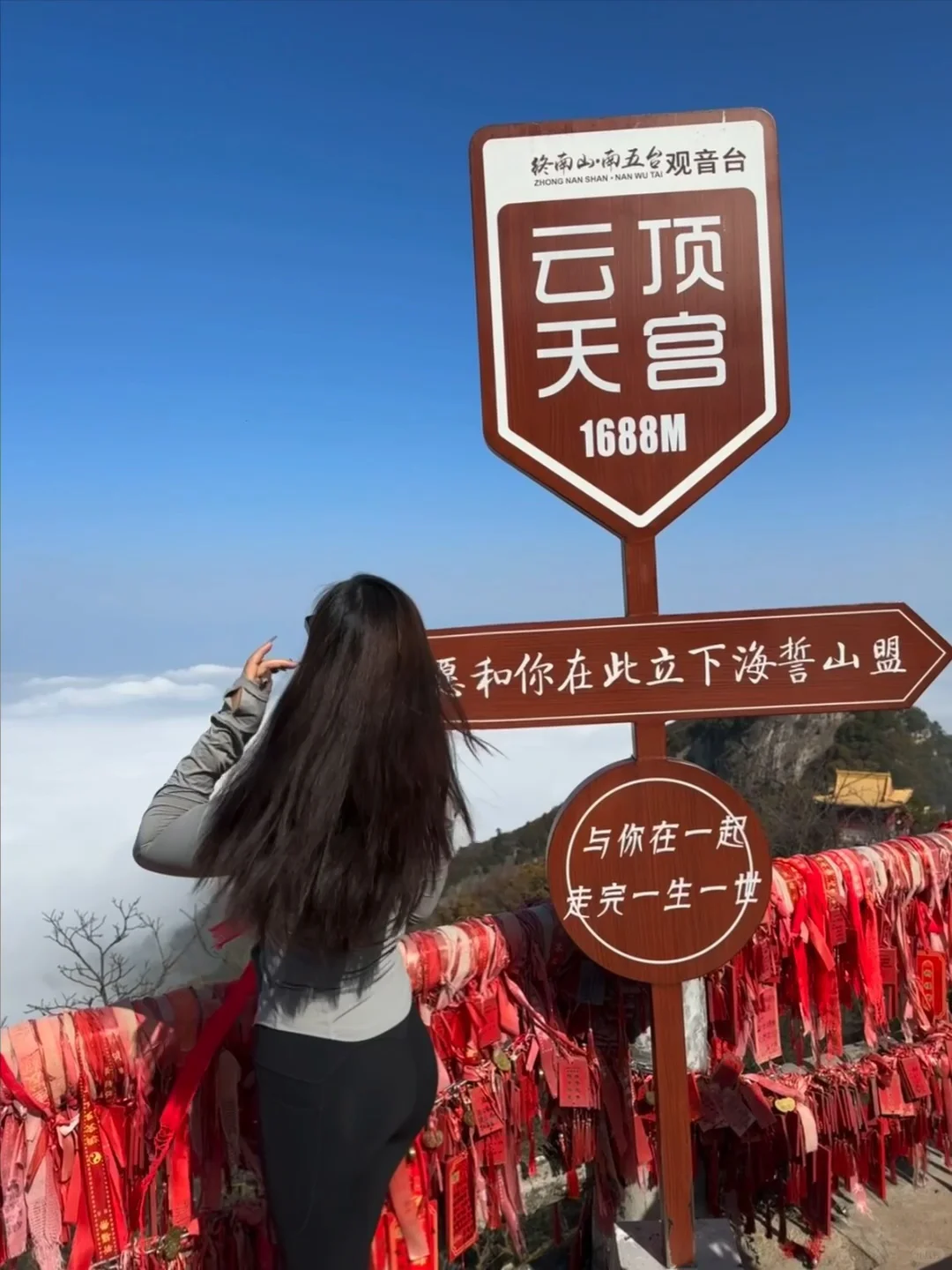 -最后是灵应台和文殊台,在文殊台许愿家人朋友学业有成,事业一帆风顺。灵应台有祈福树,用一条祈福带写上自己的心愿,系在树上寻一份心灵上的寄托✨!终南山唯一的云顶天宫⛰️也在此,南五台的云海风景很震撼,“云海翻涌腾细浪,浓雾缭绕系群山”的景象此刻在眼前浮现!