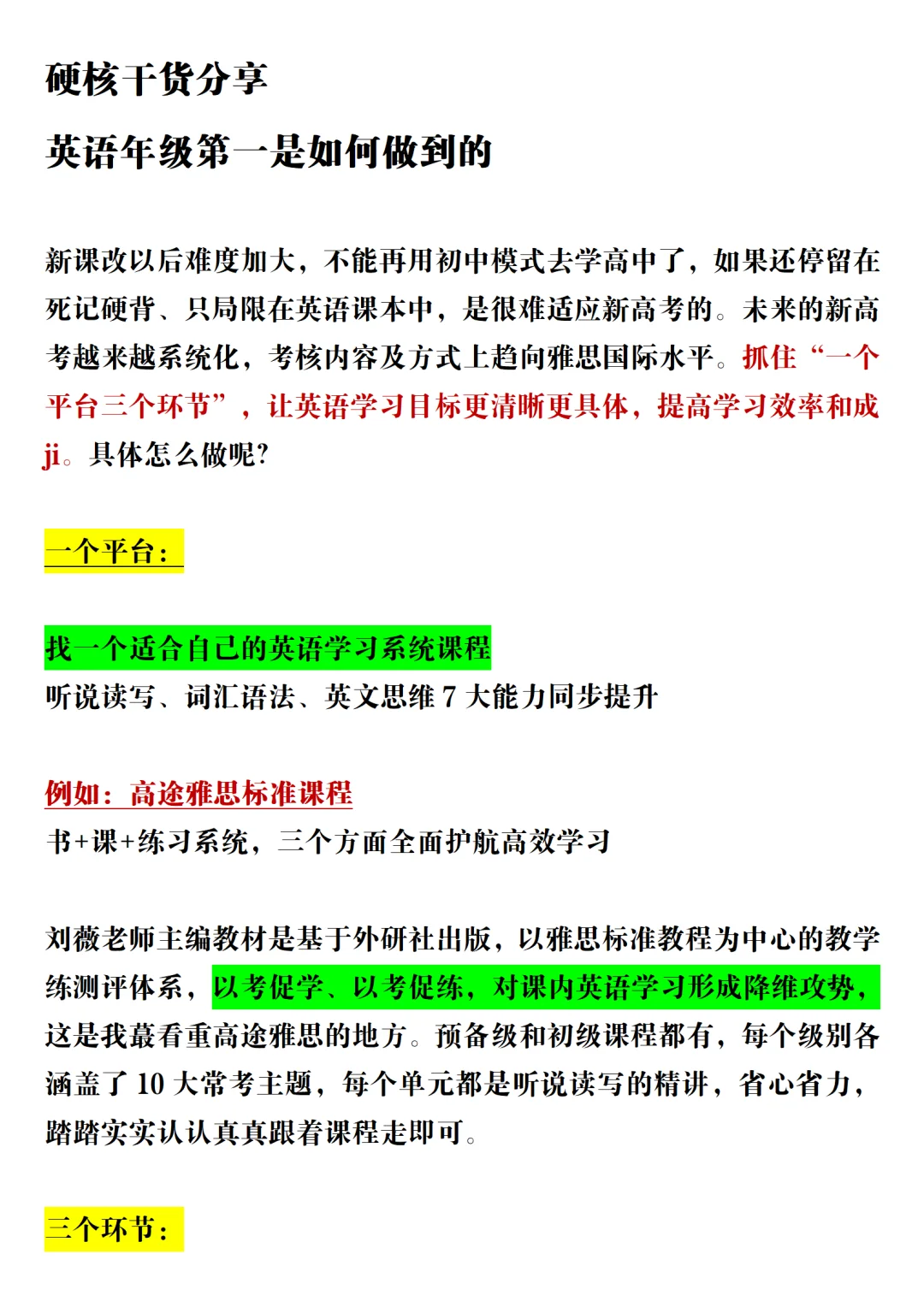 新ke改以后难度加大,不能再用初中模式去学高中了,如果还停留在死记硬背、只局限在英语课本中,是很难适应新高考的。未来的新高考越来越系统化,考核内容及方式上趋向雅思国际水平。抓住“一个平台三个环节”,让英语学习目标更清晰更具体,提高学习效率和成 ji。具体怎么做呢?