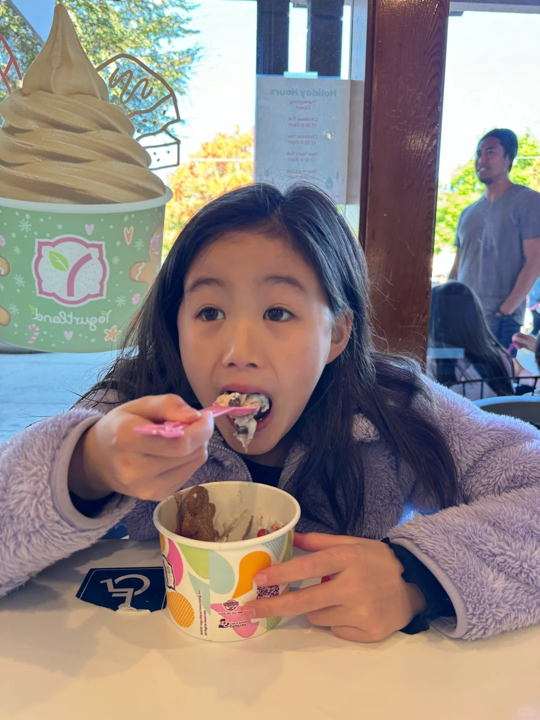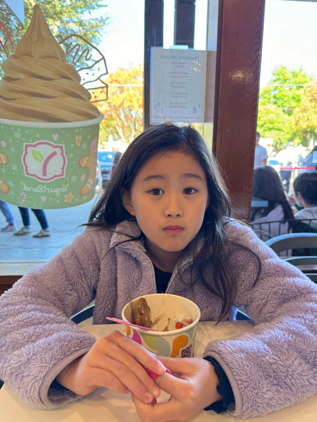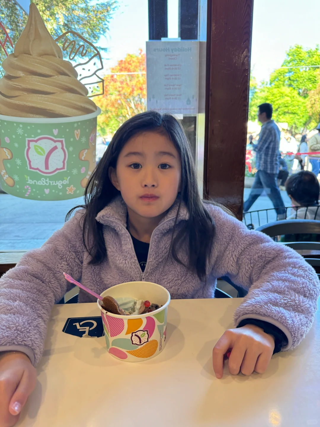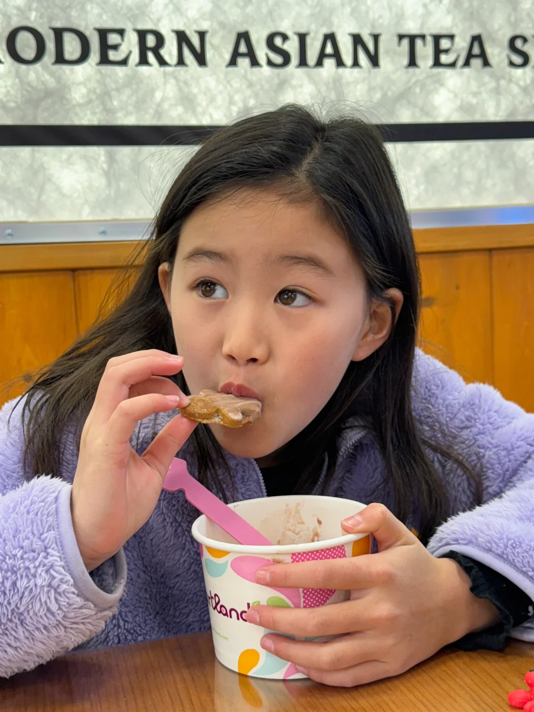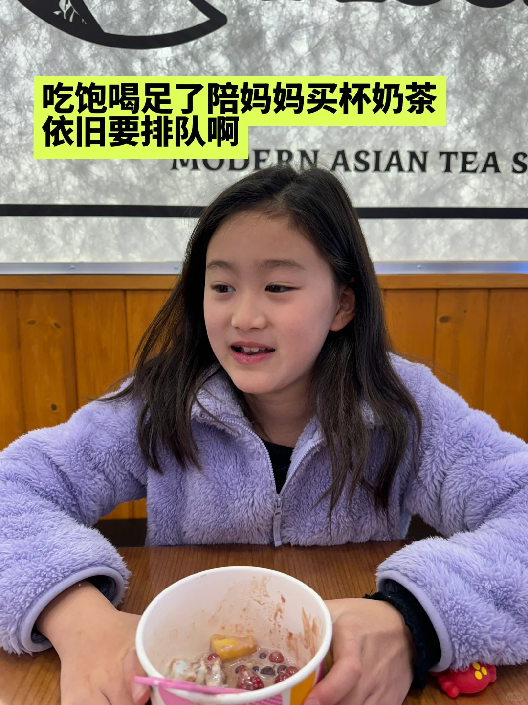 姐姐嫌队太长了放弃了,我俩吃了饭又给姐姐买了yogurt,我说陪妈妈买个奶茶吧。去了一看,还是排队[捂脸R] 湾区的奶茶店到了周末就是人从众啊。。。姐姐陪我排队等了四十分钟的奶茶,上数学课都迟到了几分钟,竟然全程没有抱怨。我问她 奶茶这个队你不觉得排太久了呀? 她说 买妈妈喜欢的东西就不觉得久