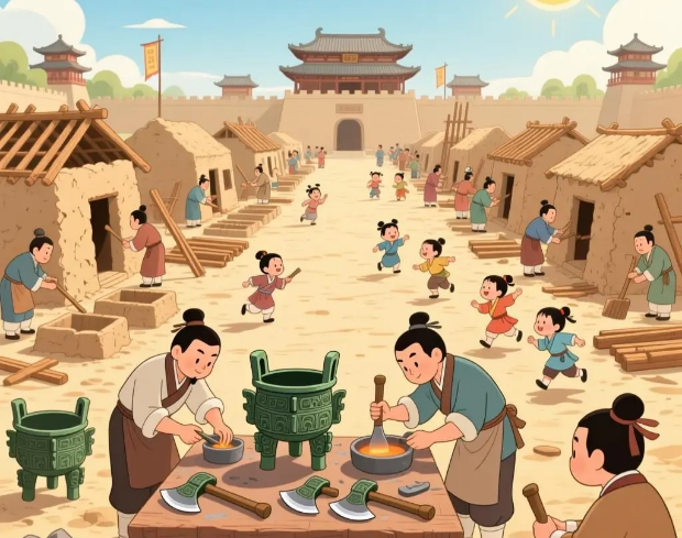 盘庚用了软硬兼施的手段,终于把首都迁到了殷。可是斗争并没有结束。老百姓到了一个新地方,生活不习惯,吵嚷着要回老家。奴隶主贵族就乘机起哄,煽动大家要求搬回老家去。盘庚又发表了一篇训诰,用强硬的语气制止住了奴隶主贵族的反对。过了几年,局面才安定下来。奴隶们在这里被迫没日没夜地劳动,把殷建设成了一个十分繁荣的都市。从此,商朝的都城就固定在殷城,政治上比较稳定,社会经济和文化也就有了更大的发展。那时候,铜的冶炼技术大大提高,青铜器的制作范围也更加扩大了。殷城附近就有一个很大的青铜器作坊,有上千个奴隶在作坊里劳动。奴隶们用铜、锡、铅三种金属做原料,冶炼铸造了成千上万件斧、钺 yuē 、戈、矛、刀、镞等武器;鼎、爵 jué 、觚 gò 、壶、盘、盂等饮食器皿 mǐn ;斧、锛 bēn 、凿、钻、铲等工具。许多青铜器造型十分优美,花纹图案十分精巧,达到了高超的艺术水平,形成了后来著称于世的青铜器文化。有一个很著名的司母戊大方鼎,高133厘米,长110厘米,宽78厘米,重875公斤,已经被考古学家从殷墟遗址中发掘了出来,完整地保存在中国历史博物馆里。这是世界上到现在为止发掘到的最大的青铜器。从商代的青铜器也可以看出,我国灿烂的古代文化,是以奴隶为主体的劳动群众创造出来的。