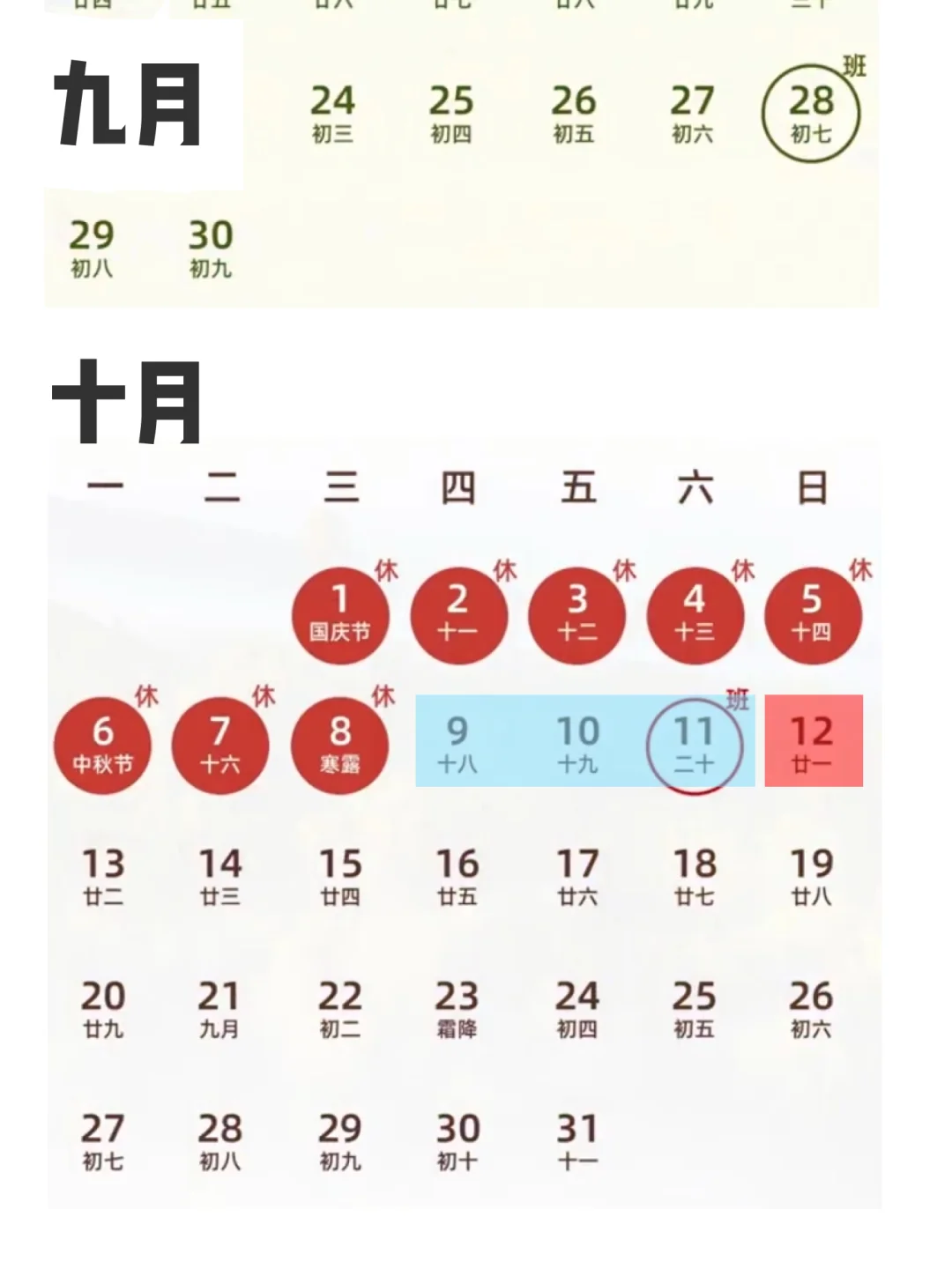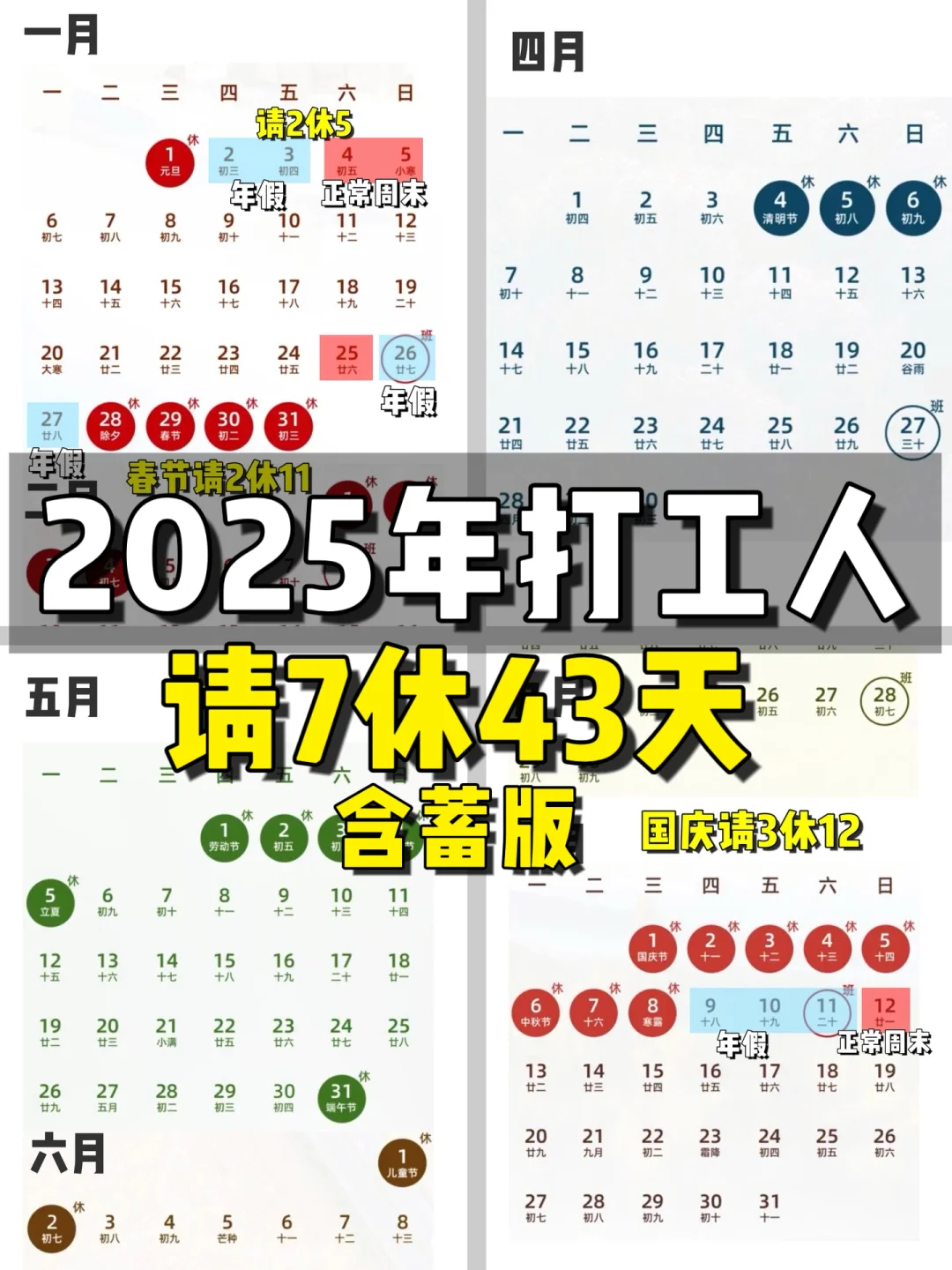 2025年春节多放一天,五一多放一天。 1️⃣元旦1月1(周三)放假一天不调休,连上周末可以请2休5。 2️⃣春节1月28~2月4放假调休共8天,连上周末可以请2休11。 3️⃣国庆&中秋10月1~8放假调休共8天,连上周末可以请3休12。 - 打工人含蓄版请假,单次不超过3天,大长假规划好了,又可以快乐出游了!