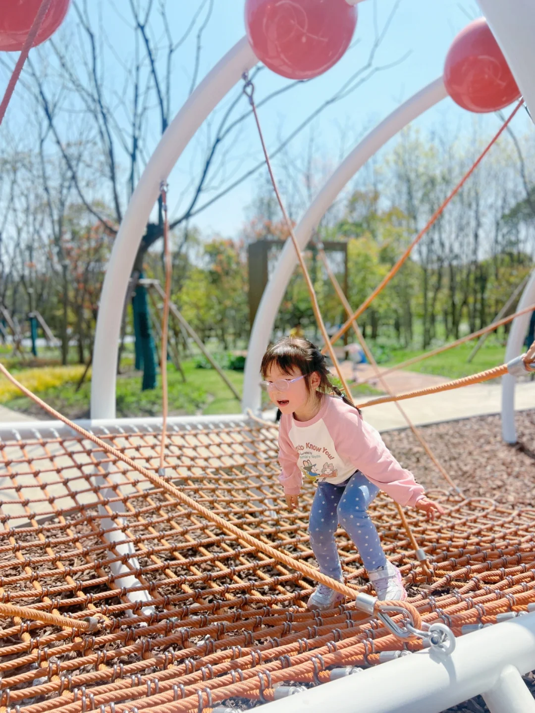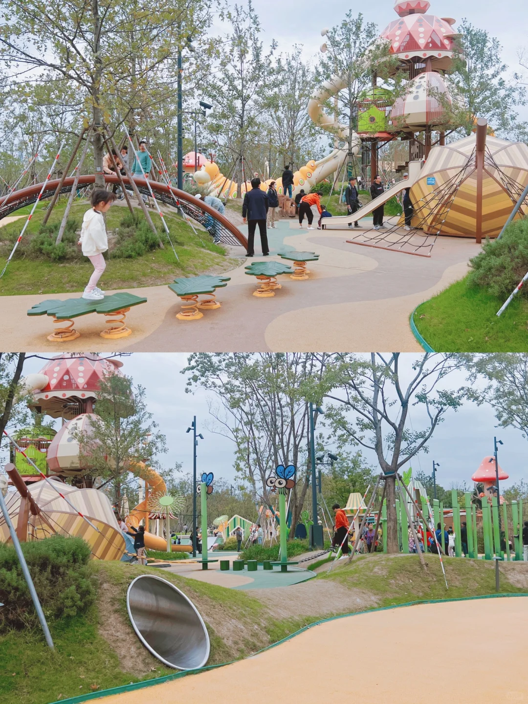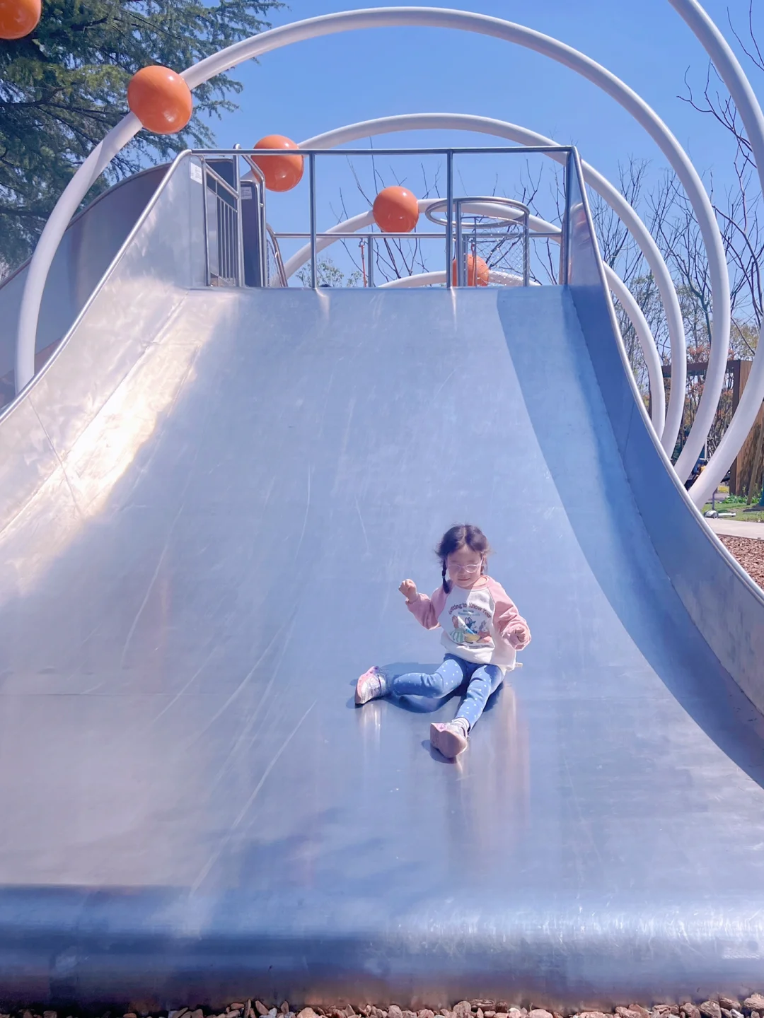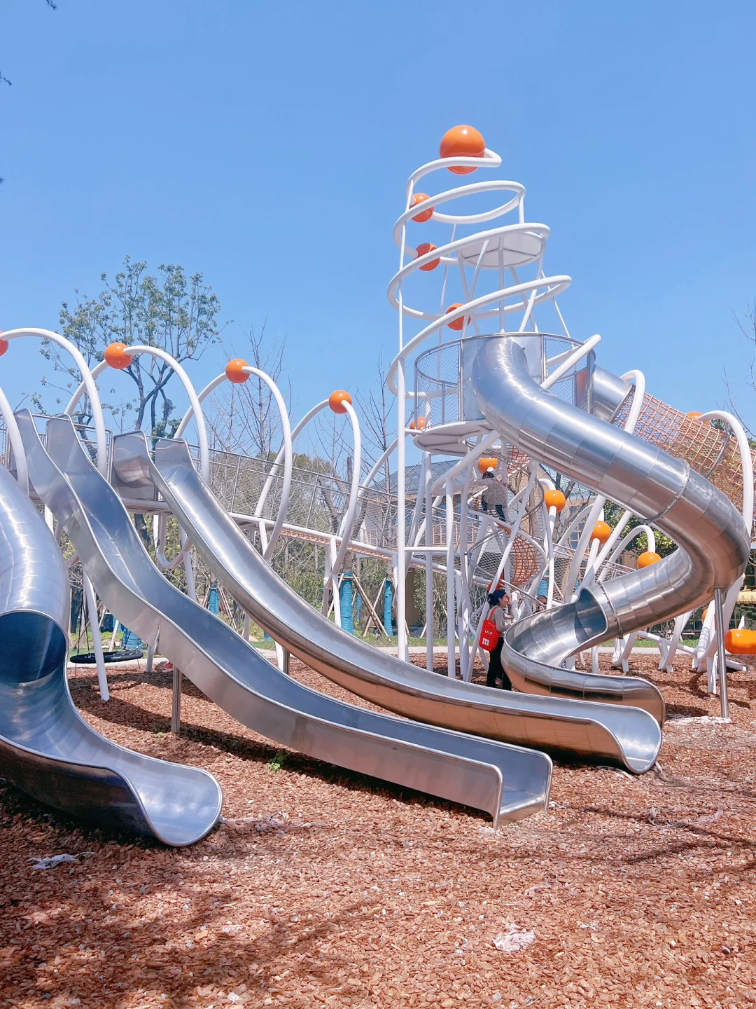 今年上半年刚开的‼️铝合金的亮面设施科技感十足,各种高度的滑道、攀爬架、跨小河的勇敢者道路、巨型沙坑、蚁穴等。儿童乐园旁边就是🚻和自助贩卖机,配套近乎完美‼️ 🉑️野餐🉑️骑行