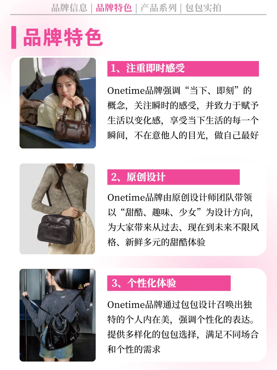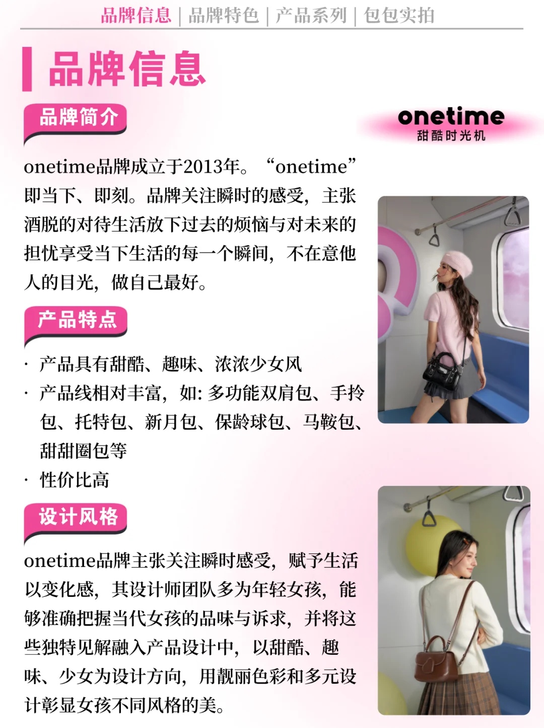 [飞吻R] 设计风格:ONE TIME品牌主张关注瞬时感受,赋予生活以变化感,其设计师团队多为年轻女孩,能够准确把握当代女孩的品味与诉求,并将这些独特见解融入产品设计中,以甜酷、趣味、少女为设计方向,用靓丽色彩和多元设计彰显女孩不同风格的美。