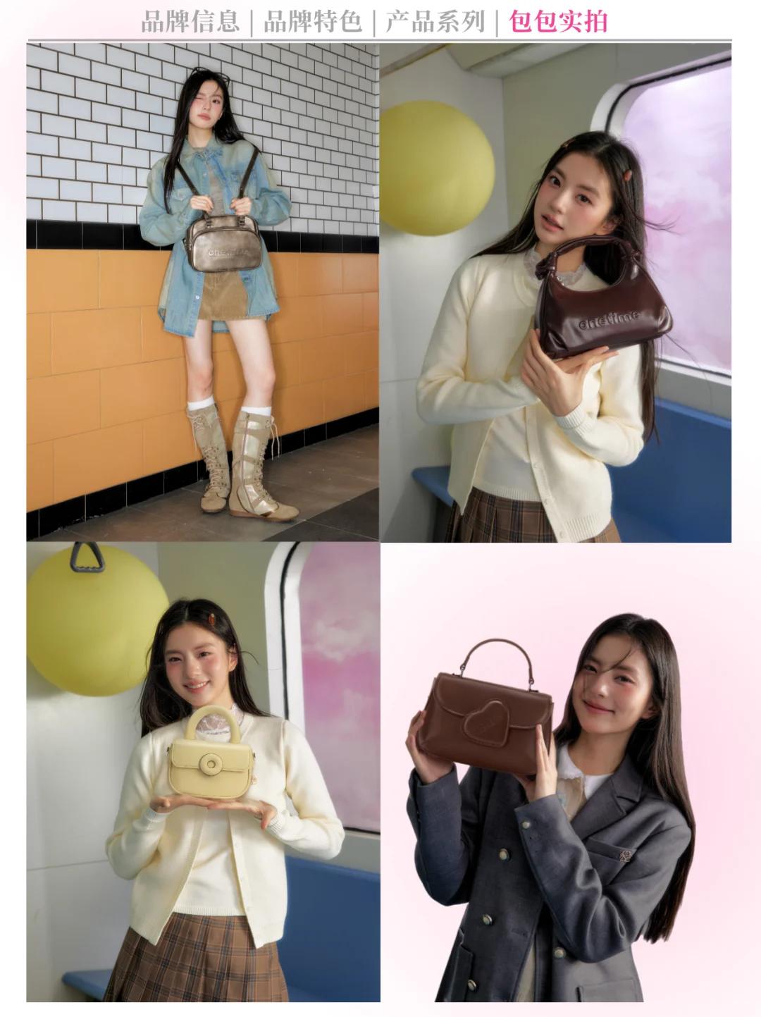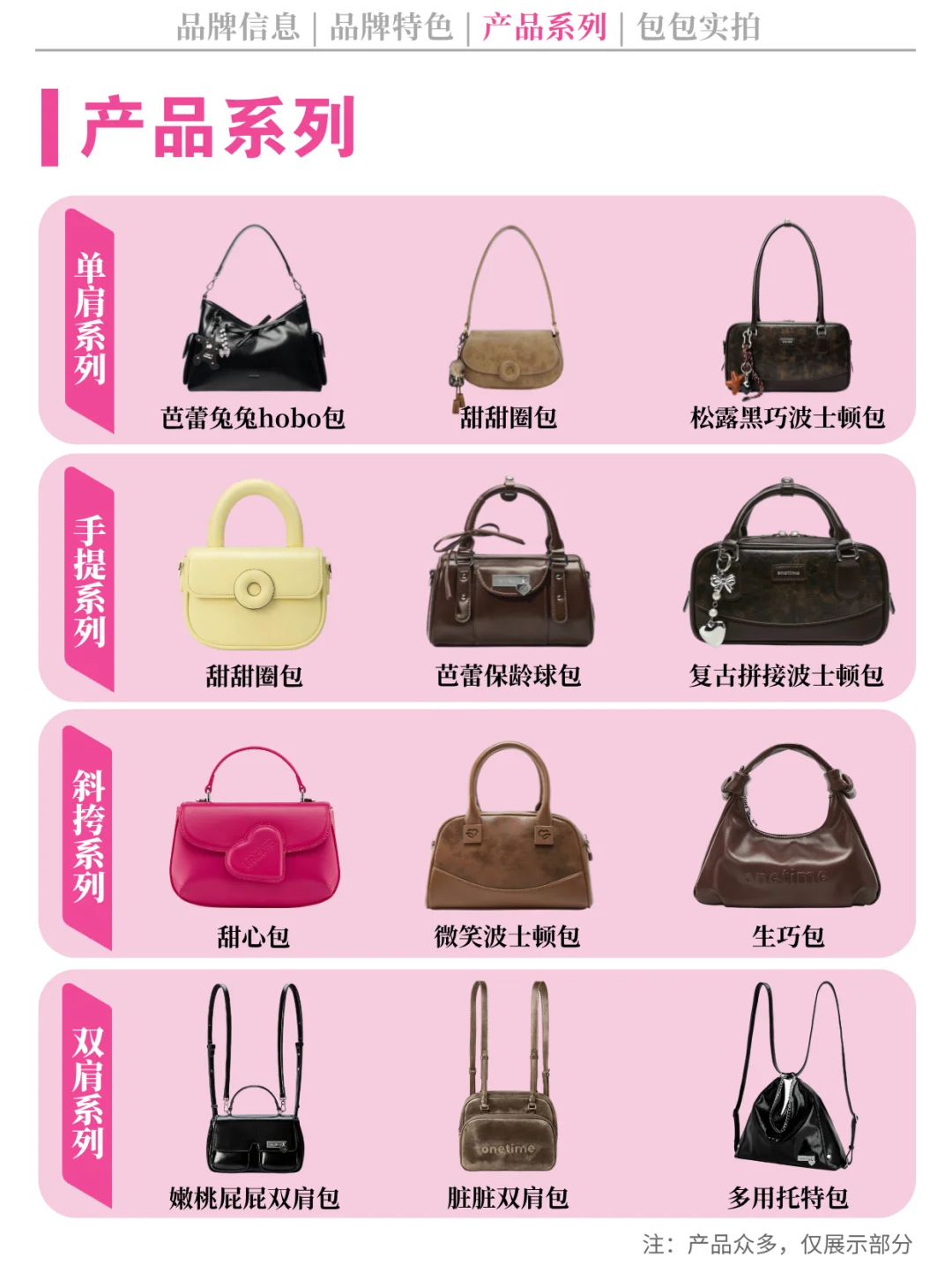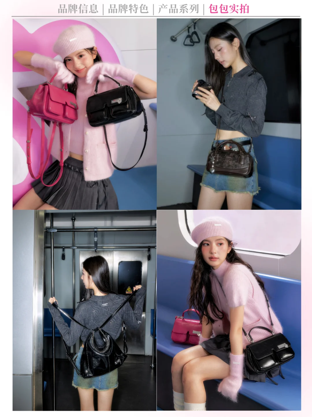 • 产品线相对丰富,如:多功能双肩包、手拎包、托特包、新 月包、保龄球包、马鞍包、甜甜圈包等