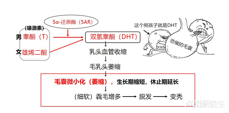 1.雄激素脱发:每个人的身体内都有一支雄激素小队,里面有个毛囊杀手叫双氧睾酮,它会破坏毛囊。生长期因此缩短,毛发逐渐变得细软,最终导致脱发。