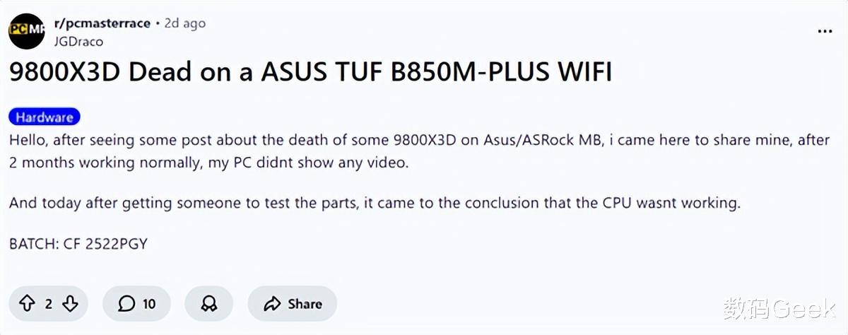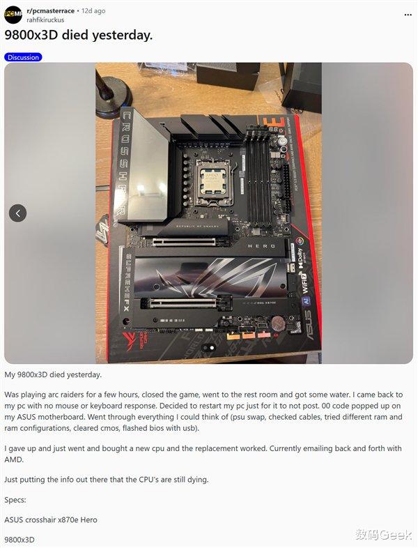问题始于9800 X3D首发时期,初期有用户报告搭载特定主板的系统出现处理器烧毁,多被归为“个别现象”。随后,网吧业主的批量故障案例让问题浮出水面。如今,个人用户社群中仍有新案例曝光,甚至有返修后再次烧毁的极端情况,加剧了用户恐慌。