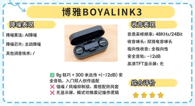 降噪升级适配户外,传输续航双提升,价格略涨性价比仍在线。作为BOYALINK的迭代款,它搭载全指向高灵敏咪头,采样规格升级至48kHz/24bit,人声收录的细节感与层次感更丰富,远超入门级水准。核心升级的ENC降噪技术,可有效过滤车流、人群等中强度环境噪音,打破室内场景限制,户外口播、轻直播也能保持收音干净。2.4GHz无线传输无遮挡100米稳定连接,新增一拖二功能,轻松应对双人访谈、搭档拍摄。续航方面,单发射器续航8小时,充电盒补能2次总续航拉满至24小时,覆盖全天拍摄无压力。美中不足的是,依旧无内置存储,断连易丢失素材;机身虽减重至9g,长时间佩戴仍有轻微坠感。整体适合想提升收音品质的进阶用户,用于户外拍摄、直播等多场景创作。