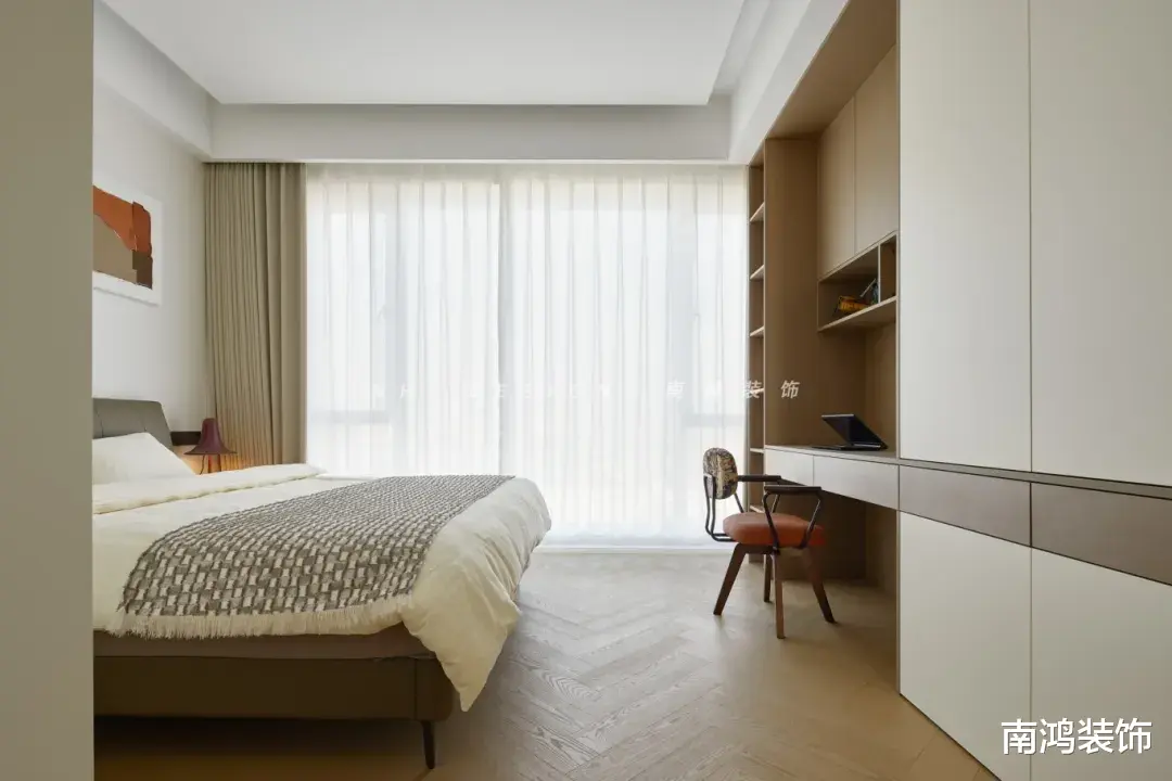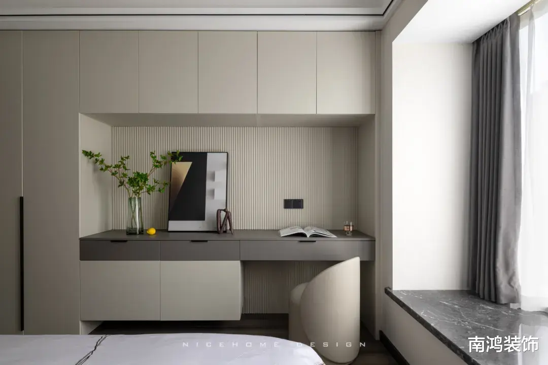 通过定制柜延伸出书桌、展示架或电视柜的方式,可帮助空间实现功能叠加,同时保持视觉连贯性。比如常见的衣柜延伸床头柜或书桌区等。