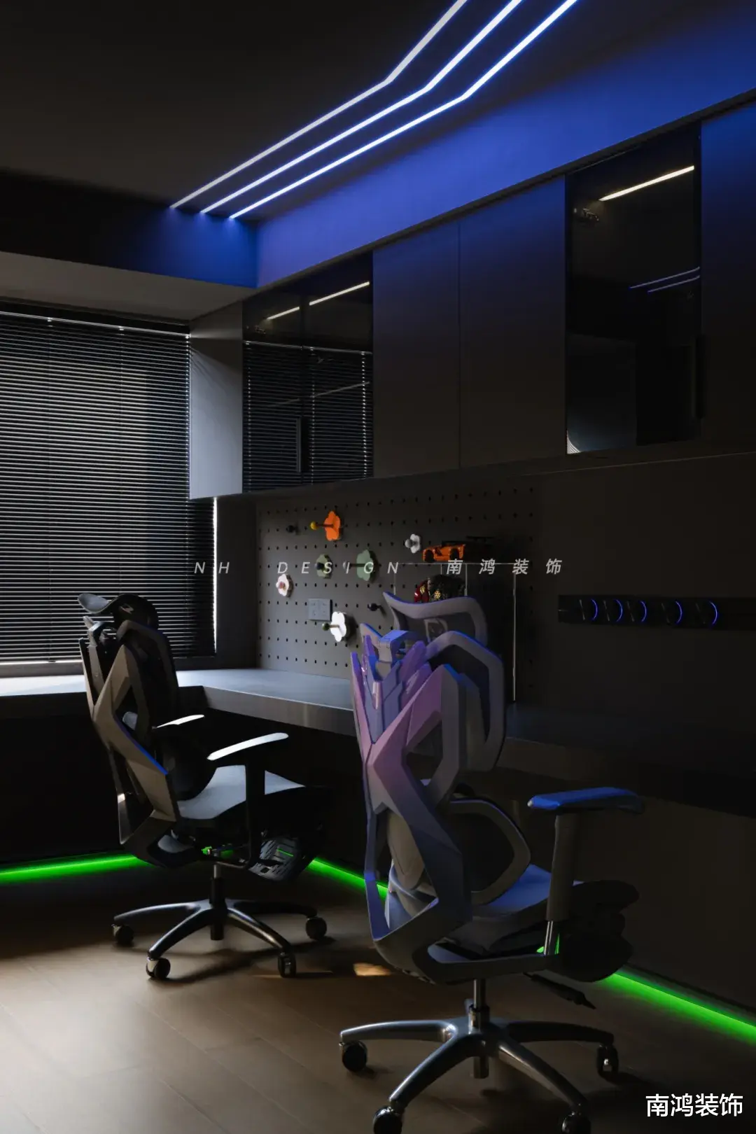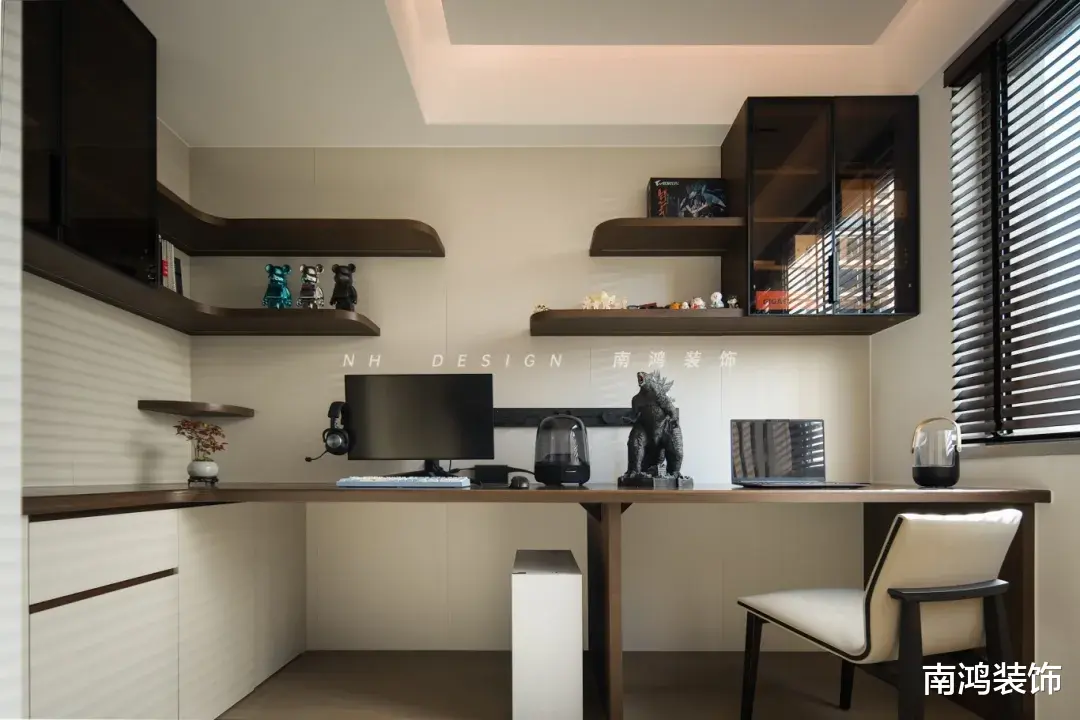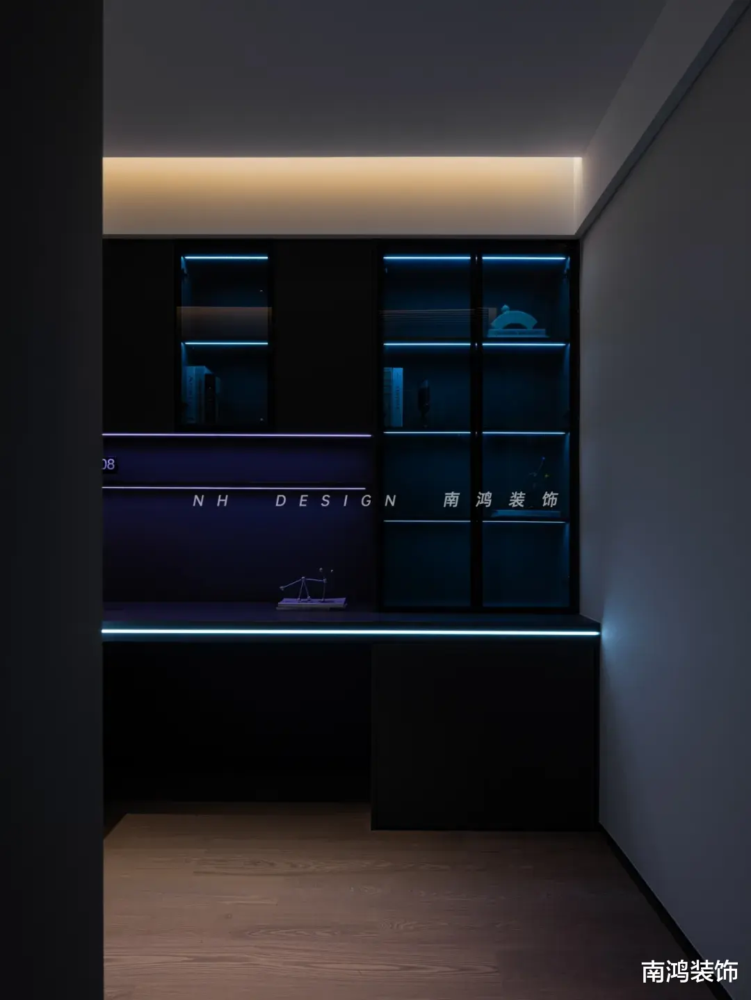 我们可以在开放格、层板下方或玻璃柜门内设置光源,比如书房、电竞房这类的空间,拉升氛围感,也能让收纳的物品更好地做呈现。