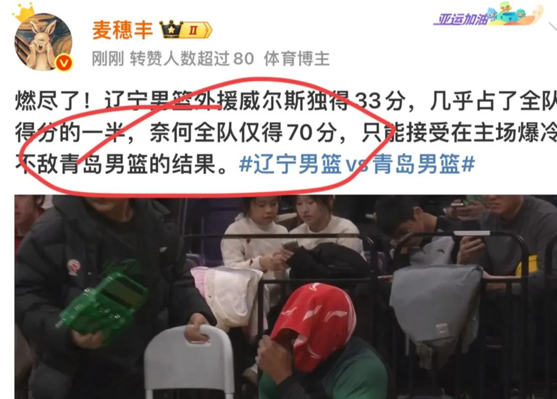 燃尽了!辽宁男篮外援威尔斯独得33分,几乎占了全队得分的一半,奈何全队仅得70分,只能接受在主场爆冷不敌青岛男篮的结果。
