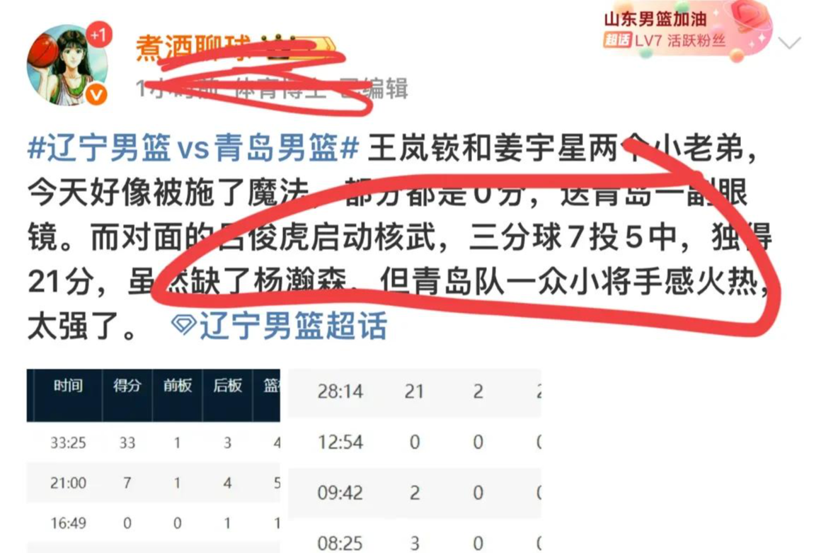 王岚嵚和姜宇星两个人今天好像被施了魔法,都是0分进账。送给青岛男篮一副眼镜。面对吕俊虎的进攻三分球7投5中,独得21分。虽然缺了杨瀚森,但青岛队的一众小将手感火热。
