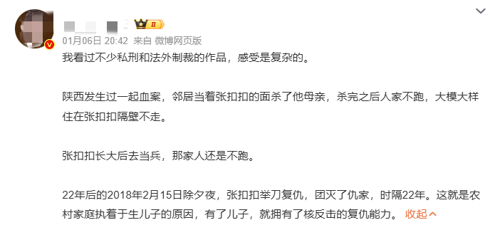 张扣扣忘不了妈妈是怎么死的,看到邻居回村过年,于是在2018年的除夕夜对邻居全家复仇。但仇人是死了,张扣扣也在2019年被执行死刑。