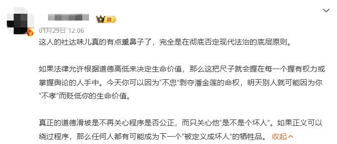 唯一提到罗翔的,是这一句:“我很讨厌罗翔这个人,但他有一句话是对的,如果有一个人特别懂法、了解法,他又不是律师,那你离这个人远点,他大概率是个人渣”。
