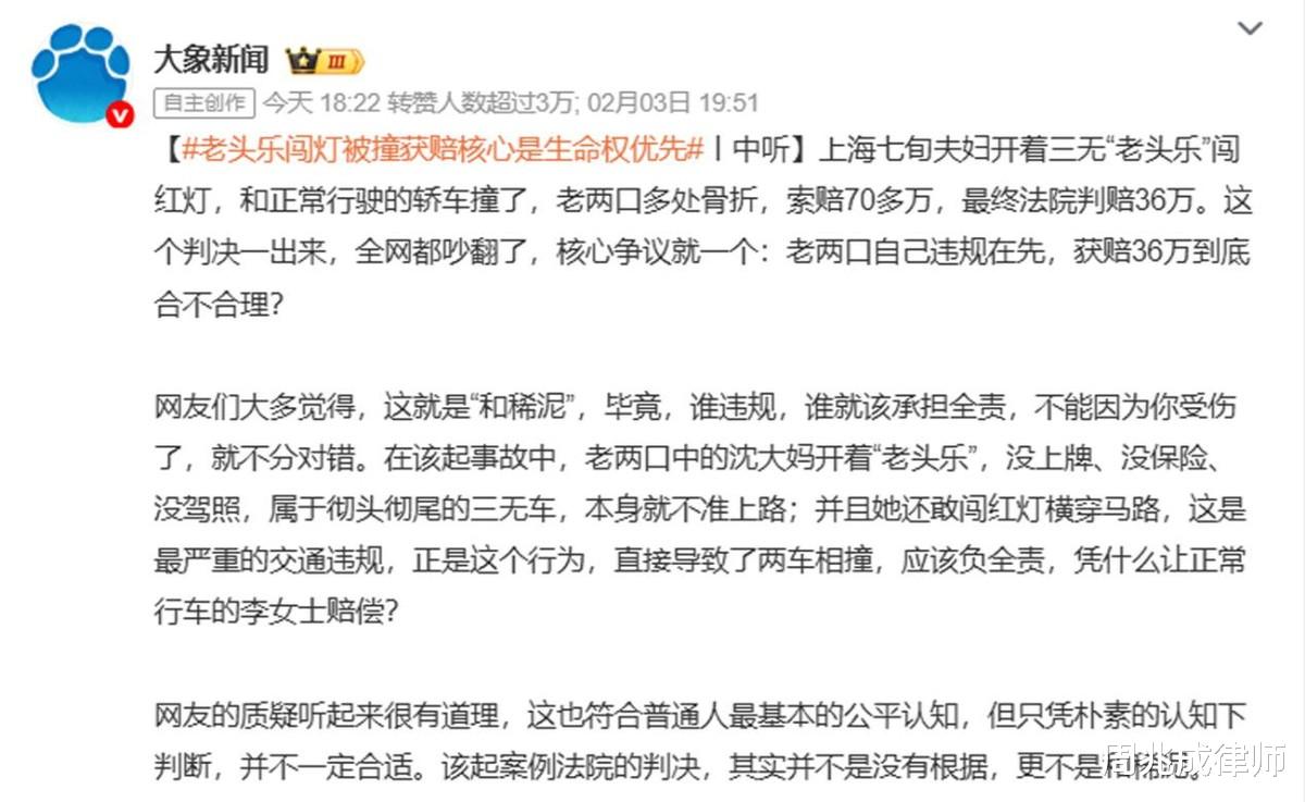 老头乐闯红灯被撞,反而能获赔36万?不少人骂“三无车辆违规还拿钱,这是鼓励‘谁弱谁有理’”!大家好,我是周兆成。