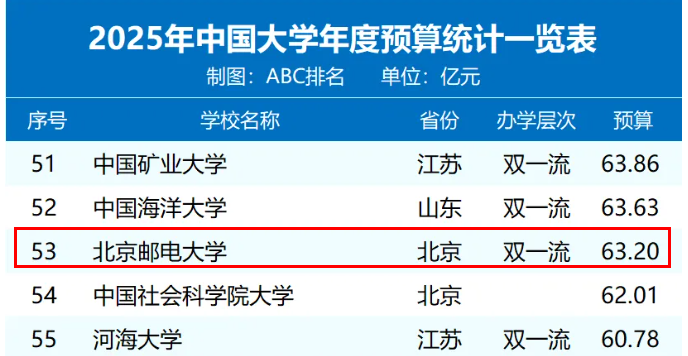 高校竞争早已告别“情怀论英雄”的时代,如今早已进入“经费决定天花板”的硬核赛道。前不久2025年中国大学年度预算经费榜单出炉,北京邮电大学以63.20亿元的数字位列全国第53位,这个数字放在一众“985”名校中或许不算拔尖,但在“双一流”行业特色高校里,却藏着最实在的办学逻辑。