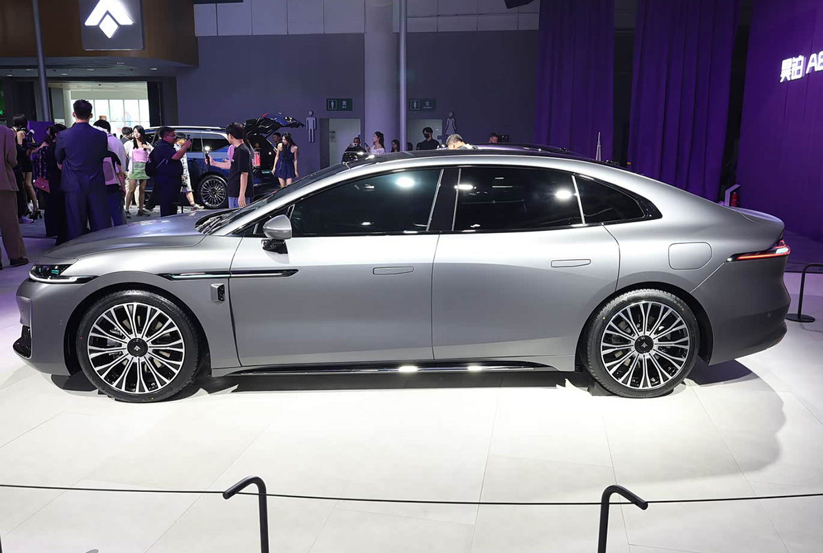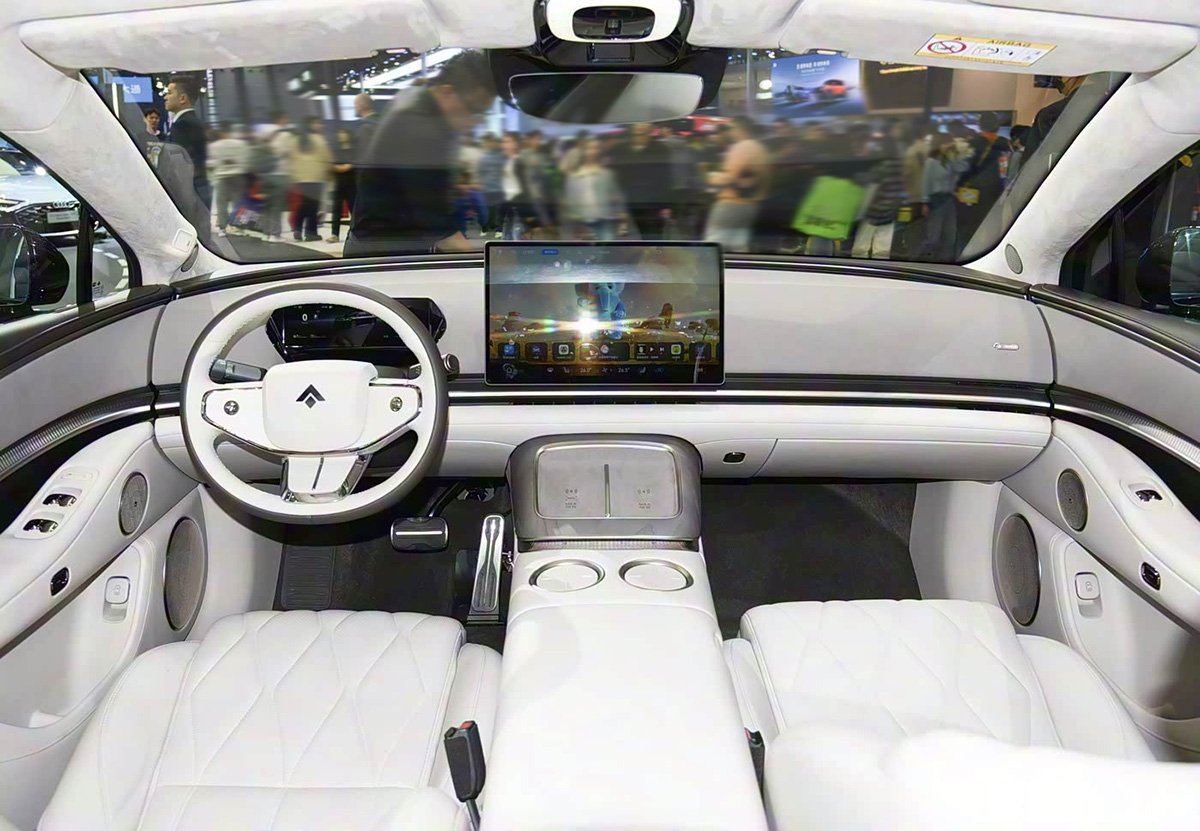 外观部分,这辆昊铂A800的前脸造型有着很高的辨识度,大灯使用了分体式设计,上部是不规则的横贯式灯带,灯带外侧延伸至前轮眉位置。前杠两侧的灯组使用了不规则的四边形轮廓,前杠下部带有横贯式的进气格栅设计。