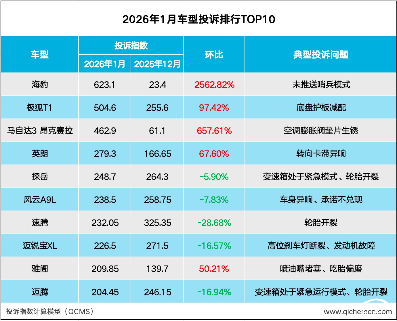 近日,汽车门网发布2025年1月车型投诉指数榜单。本月投诉榜单终于走出价格战的泥沼,开始被大量因质量问题上榜的车型占据。其中海豹空降榜首,眼看已经2026年曾经承诺的哨兵模式仍未到来引发车主集体投诉。极狐T1因底盘缺失线束护板,车主担心存在安全隐患进而投诉希望厂商能够加装。马自达3昂克赛拉爆发空调膨胀阀垫片生锈,厂商的垫片材质更换并未顾及车主利益。英朗和探岳则是转向卡滞和变速箱的老问题,老车主的坚持并未换来转机。