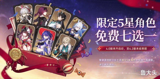 此外,4.0版本登录即可在景元、卡芙卡、饮月、镜流、花火、黄泉、砂金这七位限定五星角色中免费任选其一。