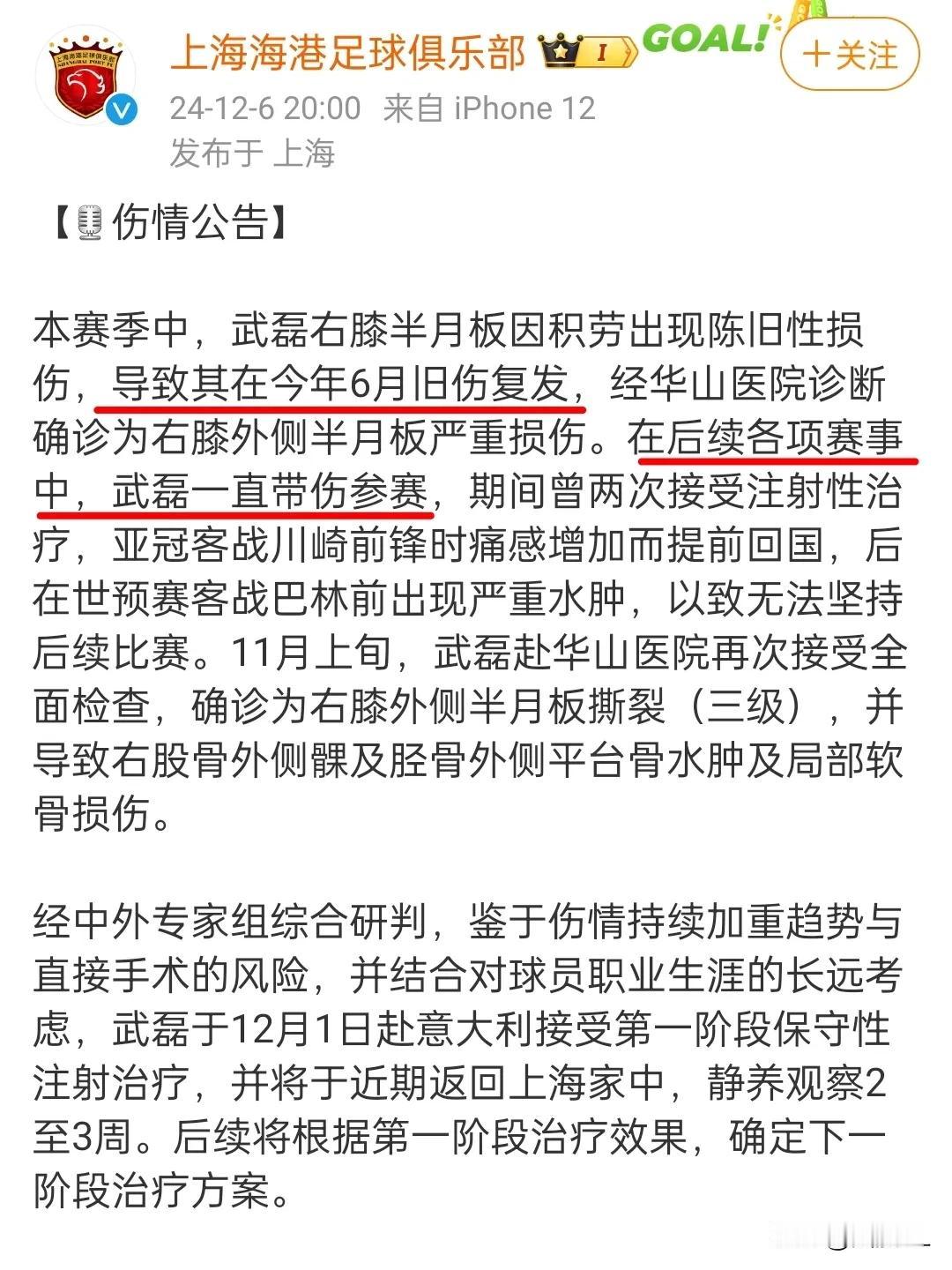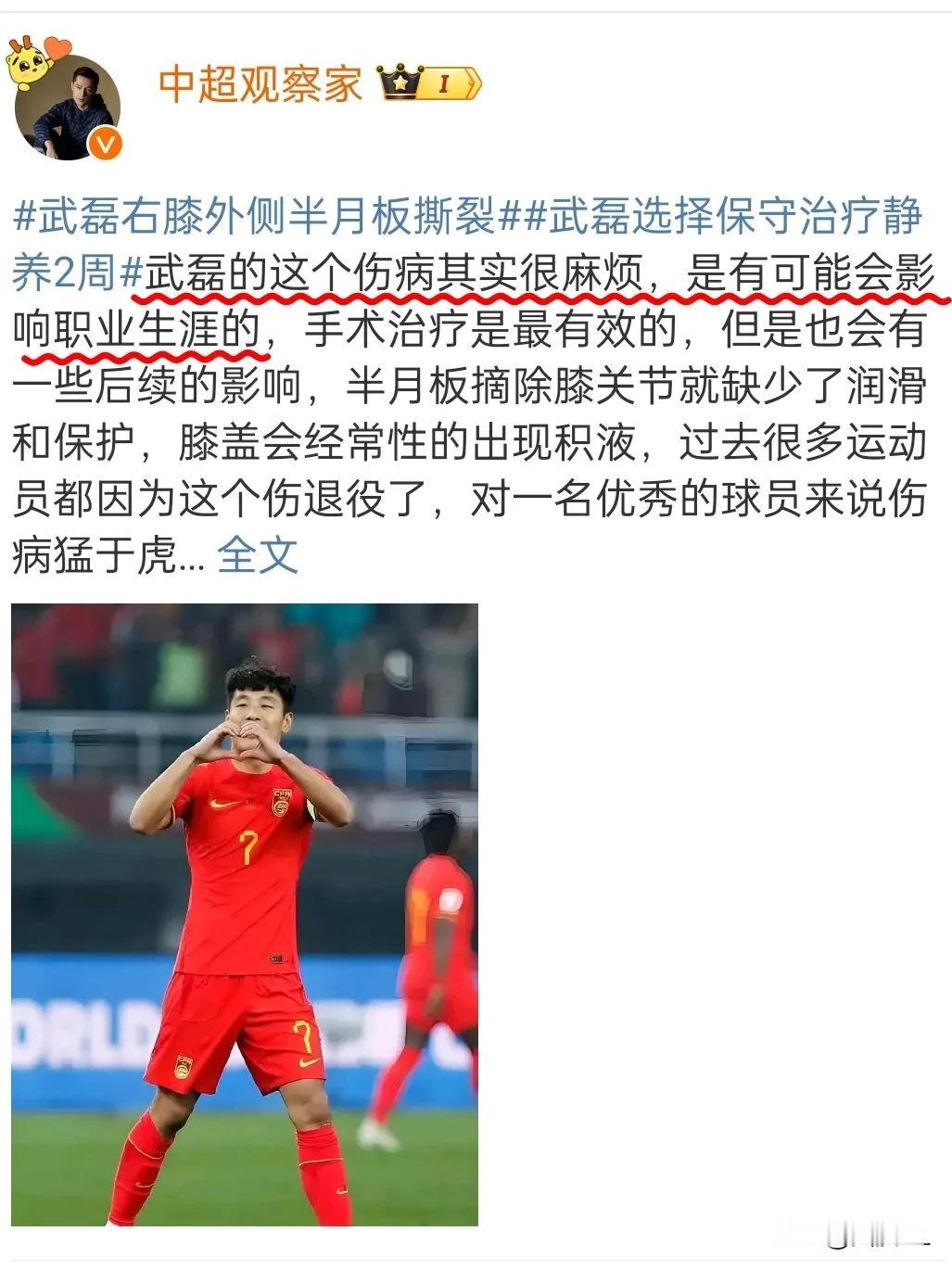 国家队比赛结束了,双冠也得了,这个时候伤情公告却来了,好不容易有关武磊的舆论热潮已经烟消云散了,现在俱乐部再搞个这种伤情公告,咋想的?再炒一波热度? 既然6月份就出现伤情复发了,穆斯卡特就不应该冒险让武磊带伤坚持比赛直到联赛结束,不但影响他为国家队争光的机会,也是拿球员的前途当儿戏。