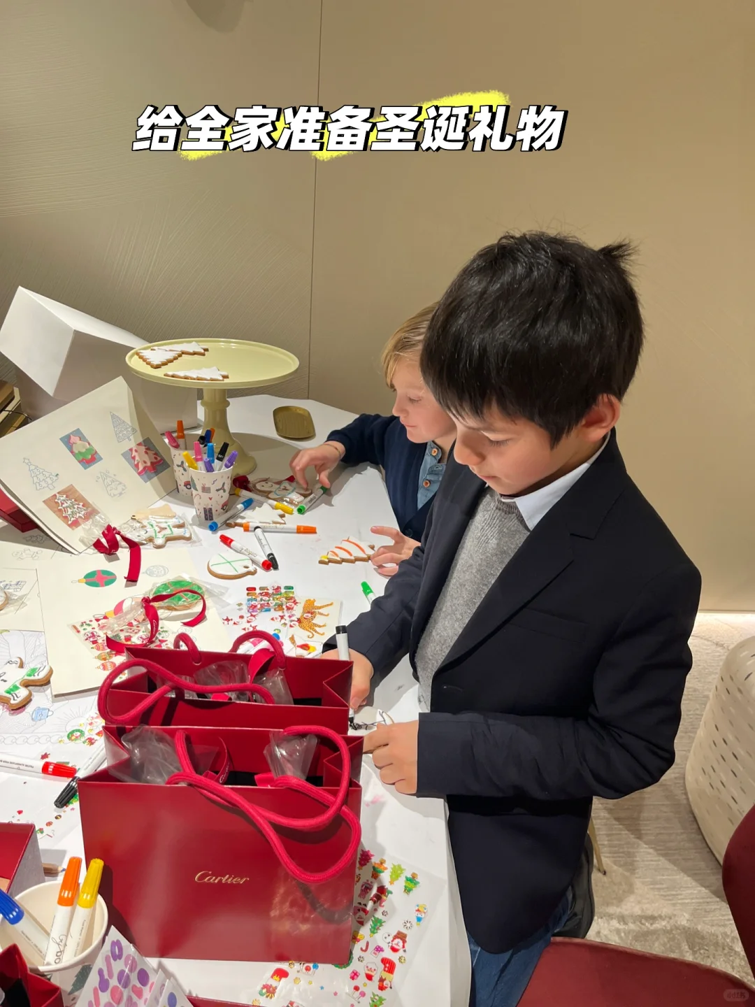 于是,卡地亚的“真价值”被瞬间发现——这俩小朋友整个下午都泡在店里,和小姐姐们精心制作神秘免费的卡地亚圣诞礼物,准备送给全家每一位亲戚。小小年纪大概已经猜出酒红色袋子能“震”人😅😂😂😂
