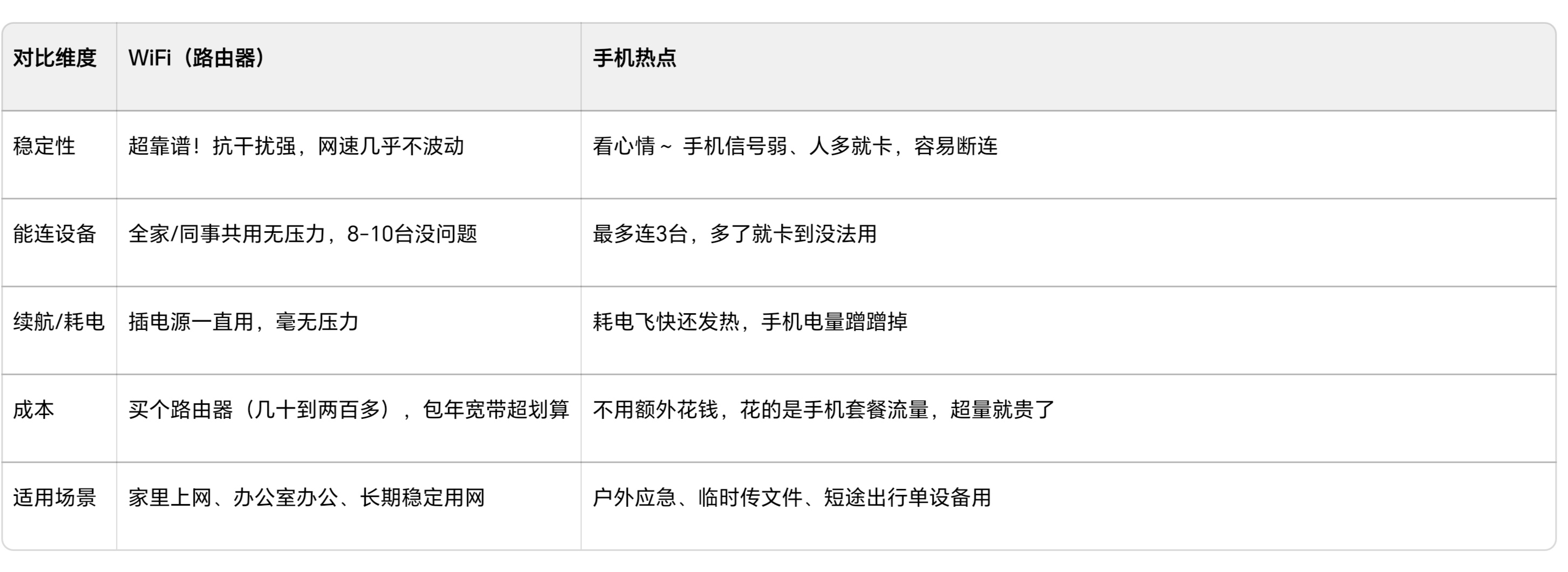 简单说,WiFi是“长期稳定款”,手机热点是“临时应急款”,根据场景选,联网体验才会更顺畅~ 要不要我帮你结合你的日常用网场景(比如通勤、居家、办公),推荐更精准的联网方案?