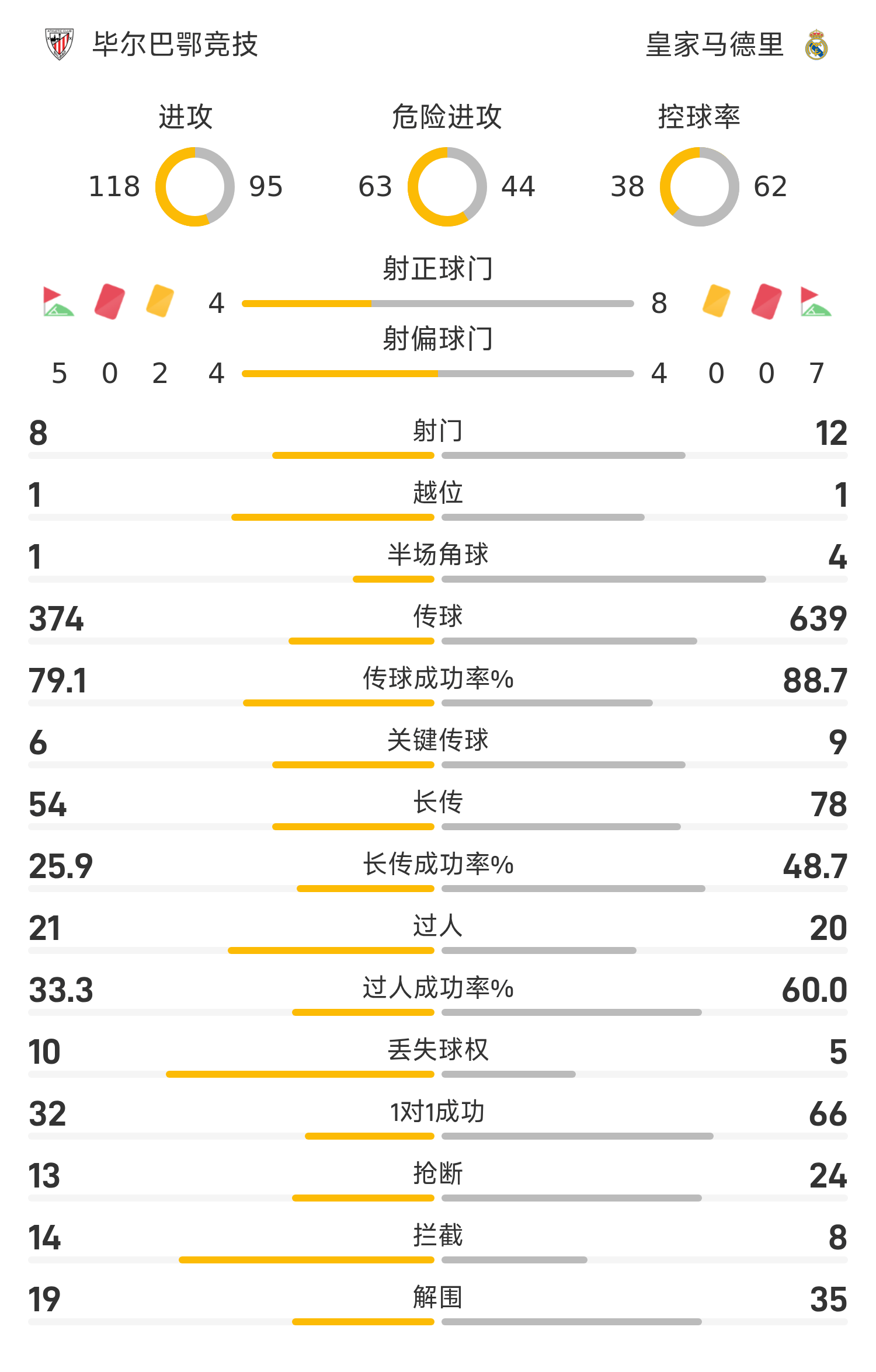 比分落后后,毕尔巴鄂竞技试图通过边路冲击寻找机会,但皇马门将库尔图瓦状态神勇,先后扑出了古鲁泽塔和贝伦格尔极具威胁的射门,力保球门不失。