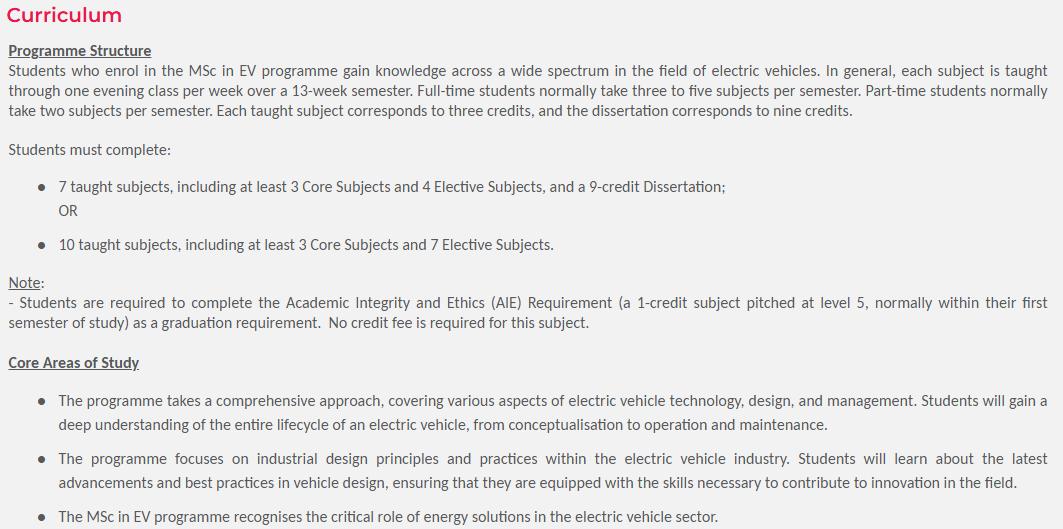 电动汽车硕士是一个综合性项目,专注于研究和实际应用,涵盖电动汽车设计与管理的各个方面。该项目特别强调电动汽车领域的工业设计、开发和能源解决方案。通过报名该项目,学生将获得宝贵的知识和技能,显著提升他们在电动汽车技术、系统运行和管理领域的职业前景。该项目还为学生提供了独特的机会,探索电动汽车的复杂性及该领域的创新解决方案。 电动汽车理学硕士(MSc in EV)项目旨在实现以下目标:为毕业生提供涵盖研究与实际应用的电动车全面理解。通过全面的课程,学生将深入了解电动汽车的各个方面,包括设计、技术、能源解决方案和管理。 应对香港、中国及全球电动汽车领域对高技能专业人员日益增长的需求。通过为学生提供专业技能和实践技能,该项目旨在满足行业日益增长的对合格人才的需求,这些人才能够为电动出行解决方案的开发和采用做出贡献。
