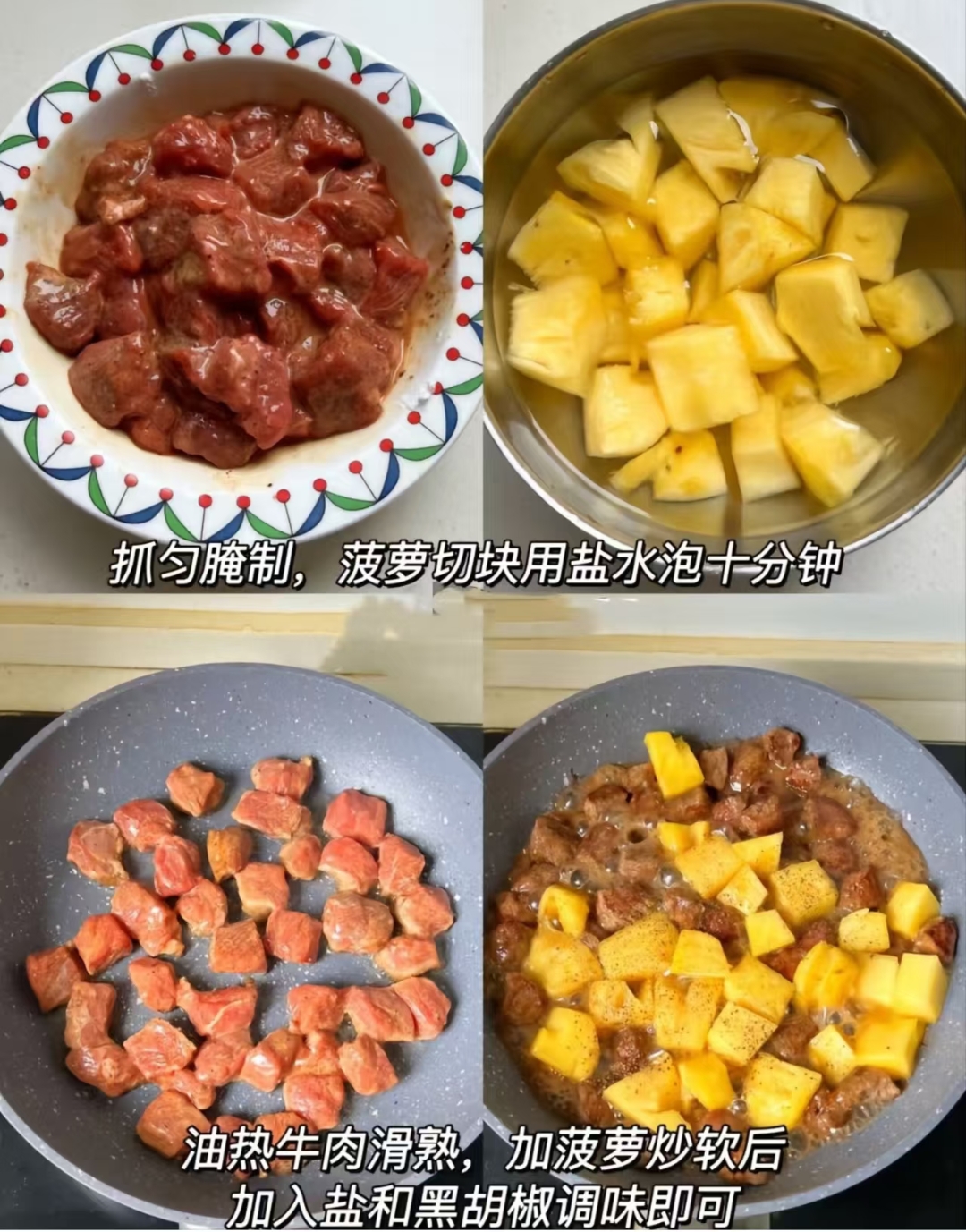 趁着腌肉的空档,我们来处理菠萝。将菠萝切成小巧的块状,记得一定要放进盐水里浸泡十分钟,这个步骤能有效去除菠萝的涩味,只留下满满的清甜。接下来就是最治愈的烹饪环节了,锅中倒油,待油温升起,将腌制好的牛肉滑入锅中。随着“滋啦”一声,肉肉在热油中迅速变色,那是专属烹饪者的治愈时刻。将牛肉滑熟后,加入泡好的菠萝块快速翻炒,看着菠萝在热力作用下变得软软的,酸甜的果汁慢慢渗出,再根据个人口味加入适量的盐和黑胡椒进行最后调味,翻炒均匀后,这道色香味俱全的佳肴就大功告成了。
