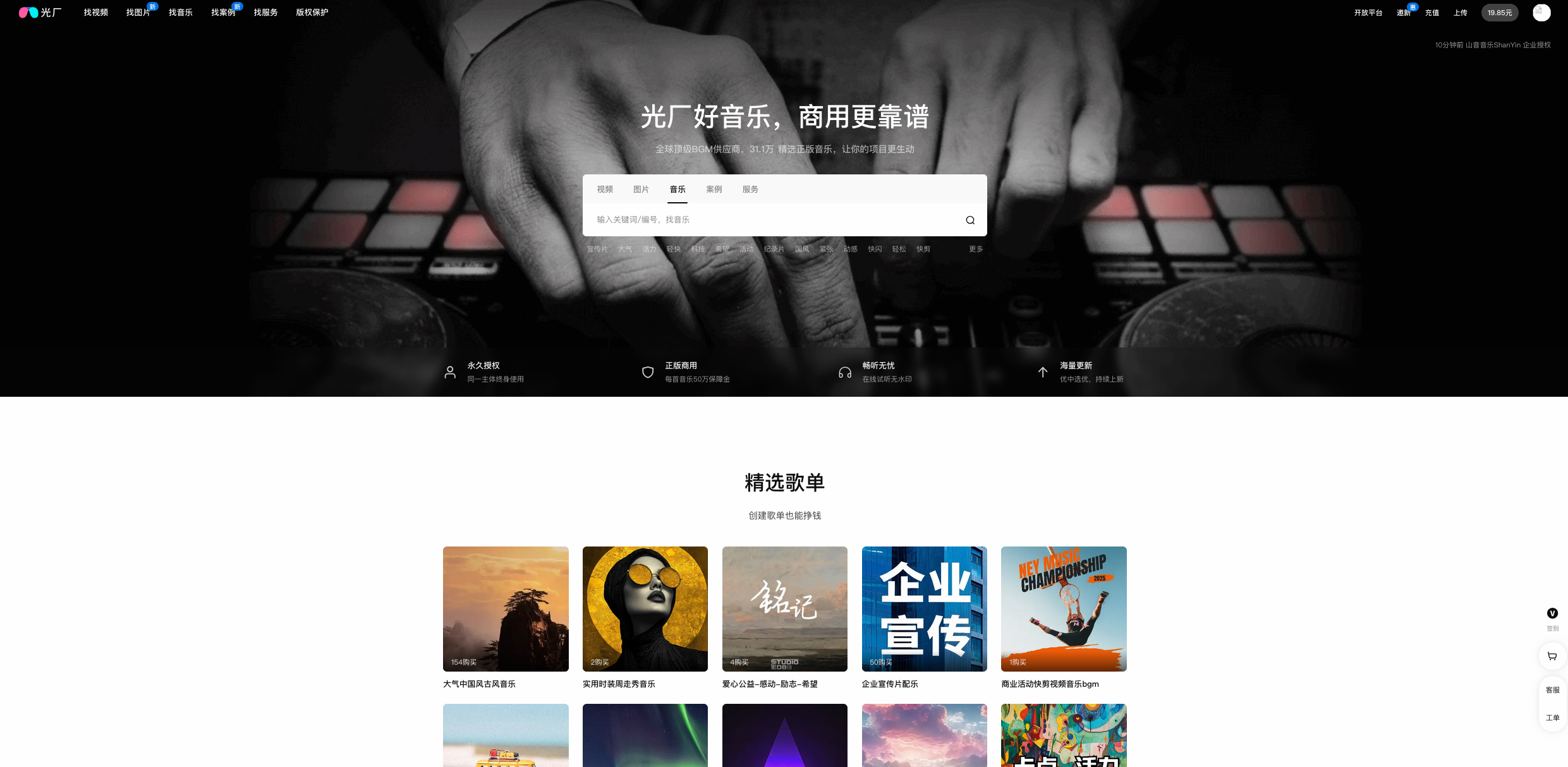 光厂是国内最早和最具影响力的商用版权音视频交易平台之一。 其音乐专区自2015年上线以来,已积累了超过120万条正版音乐素材,形成了庞大的资源矩阵。