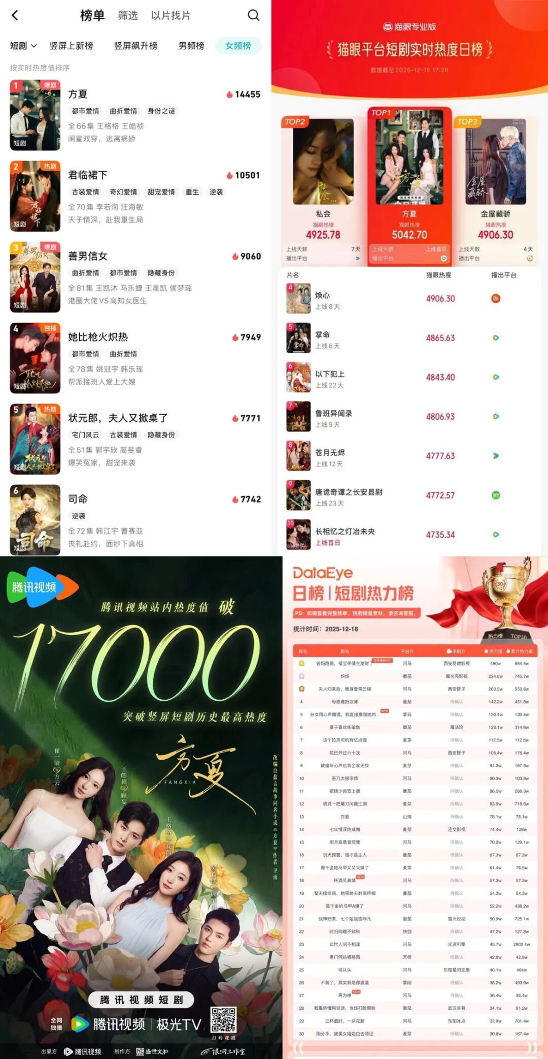 腾讯视频的《方夏》,12月15日上线即爆:站内,直接登顶热搜总榜TOP2、电视剧榜TOP1、热度飙破17000;站外,登顶猫眼平台短剧实时热度日榜TOP1、位列抖音娱乐榜话题第19位。12月18日,剧集登上DataEye短剧热力日榜第13位。